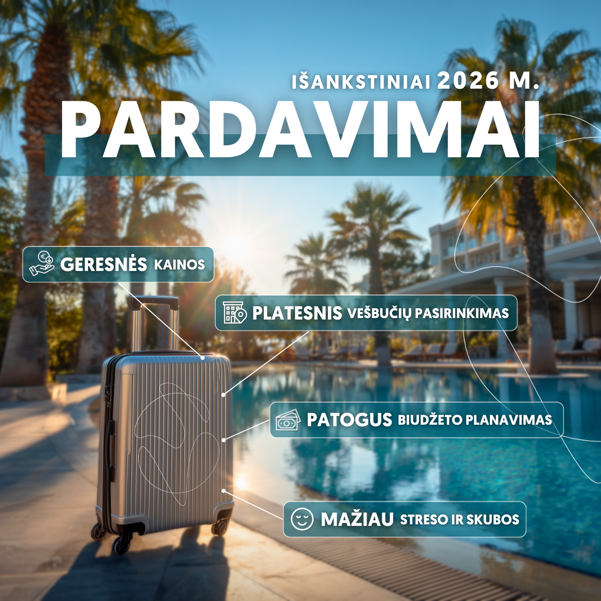 2026 M. KELIONĖS! Išankstiniai 2026m. atostogų pardavimai JAU ČIA! Jau galite rinktis iš pirmųjų pasiūlymų 2026m. atostogoms! Pirkti keliones iš anksto - VERTA! Turkija, Graikija, Juodkalnija, Egiptas! Rinkis vasaros atostogas iš anksto drąsiai!