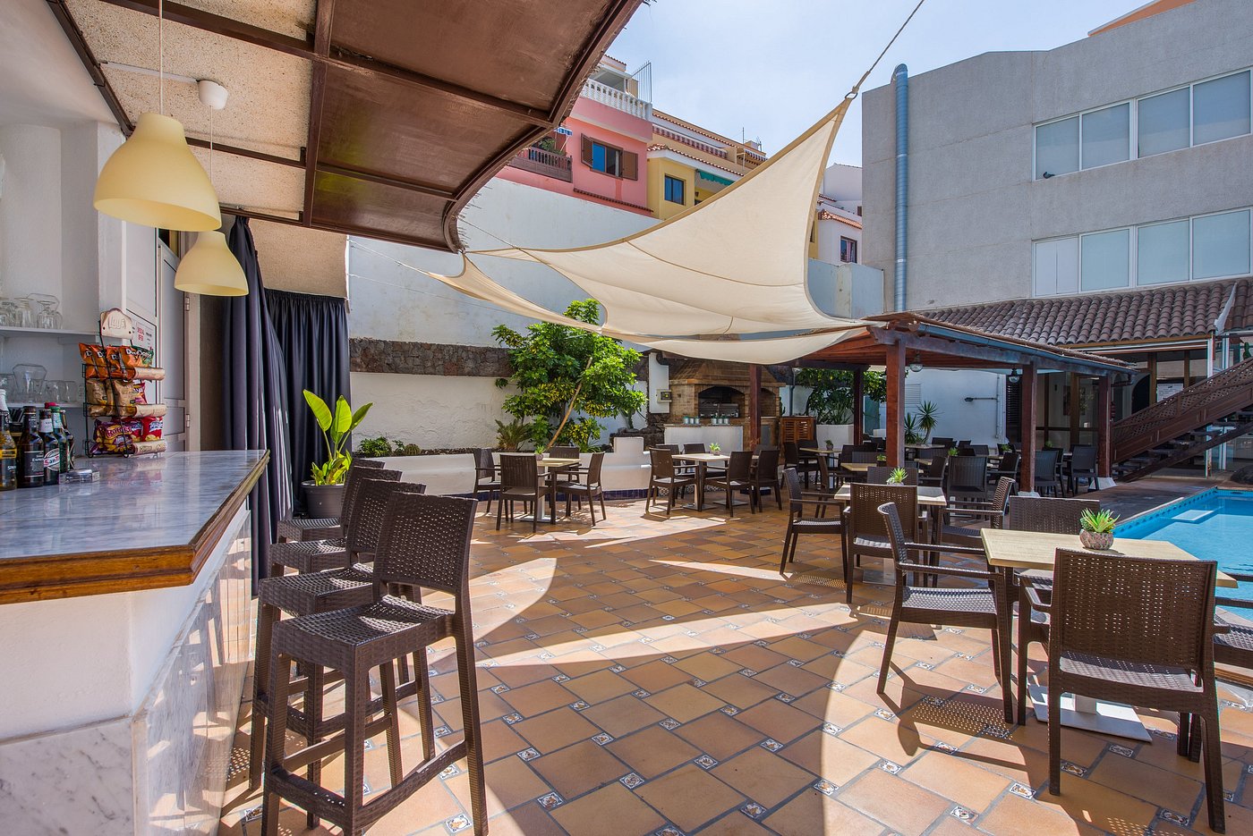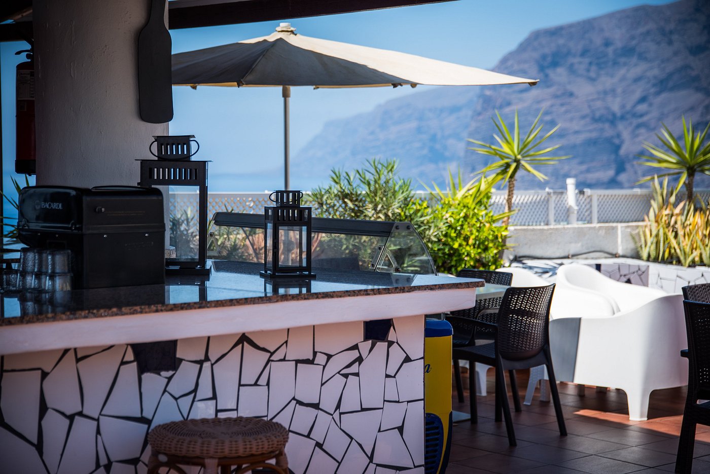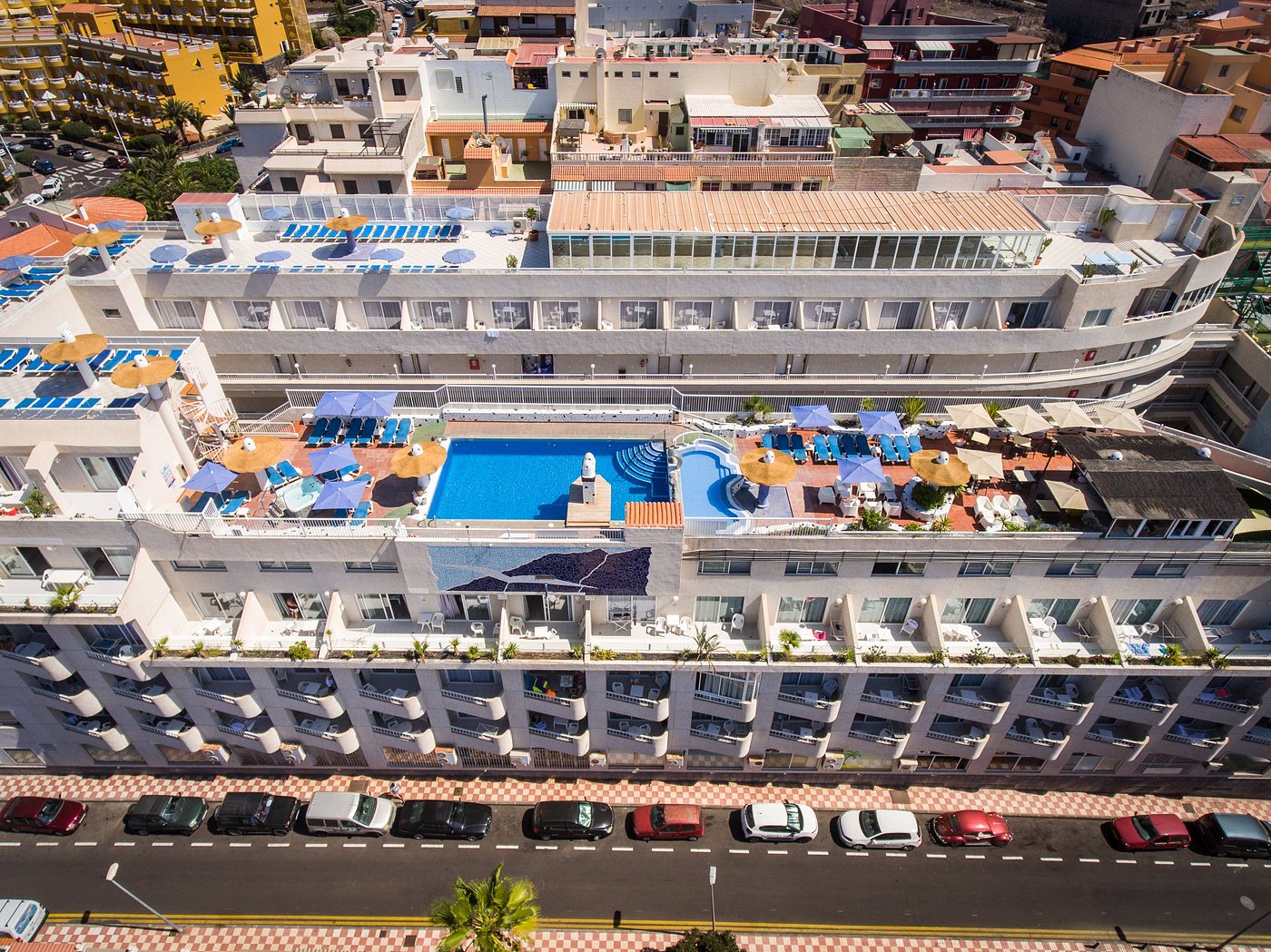 Los Gigantes centre, šalia Lidl, įėjimas į viešbutį per prekybos centrą. Seifas 15 eur, nėra kondicionierių, tik ventiliatoriai, kūdikių lovytės. Miegamajame dvigulės lovos. Labai tvarkingi kambariai ir fantastiškas vaizdas į Los Gigantes olas ar vandenyną. Įrengtos virtuvės. Užimtumas dažniausiai 100%. Belaidis internetas nemokamai tik registratūroje, kambaryje 20 eur. Planuojamas nemokamas wifi. Ant stogo baseinas, jacuzzi, baras. Apačioje kiemelyje šildomas baseinas nuo lapkričio. Rekomenduoju poroms ir suaugusiems.