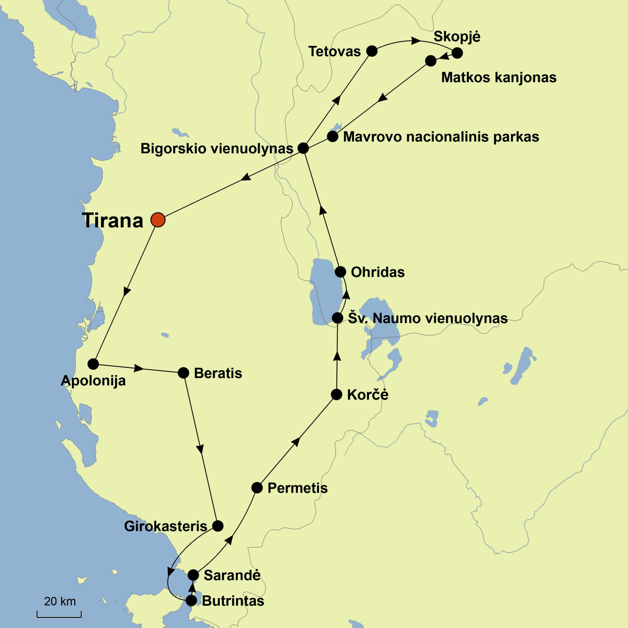 Papusryčiavę leisimės į vaizdingą kelionę Albanijos link. Atvyksime į Tiraną. Po pietų lankysimės BUNK'ART 2 – įspūdingame muziejuje Tiranoje, įsikūrusiame buvusiame slaptame branduoliniame bunkeryje, kuris buvo pastatytas 1981–1986 m. Muziejus apima 24 kambarius, kuriuose pristatoma Albanijos istorija nuo 1912 iki 1991 metų, ypatingą dėmesį skiriant komunistinio režimo laikotarpiui ir slaptosios policijos „Sigurimi“ veiklai. Nakvynė viešbutyje Tiranoje.