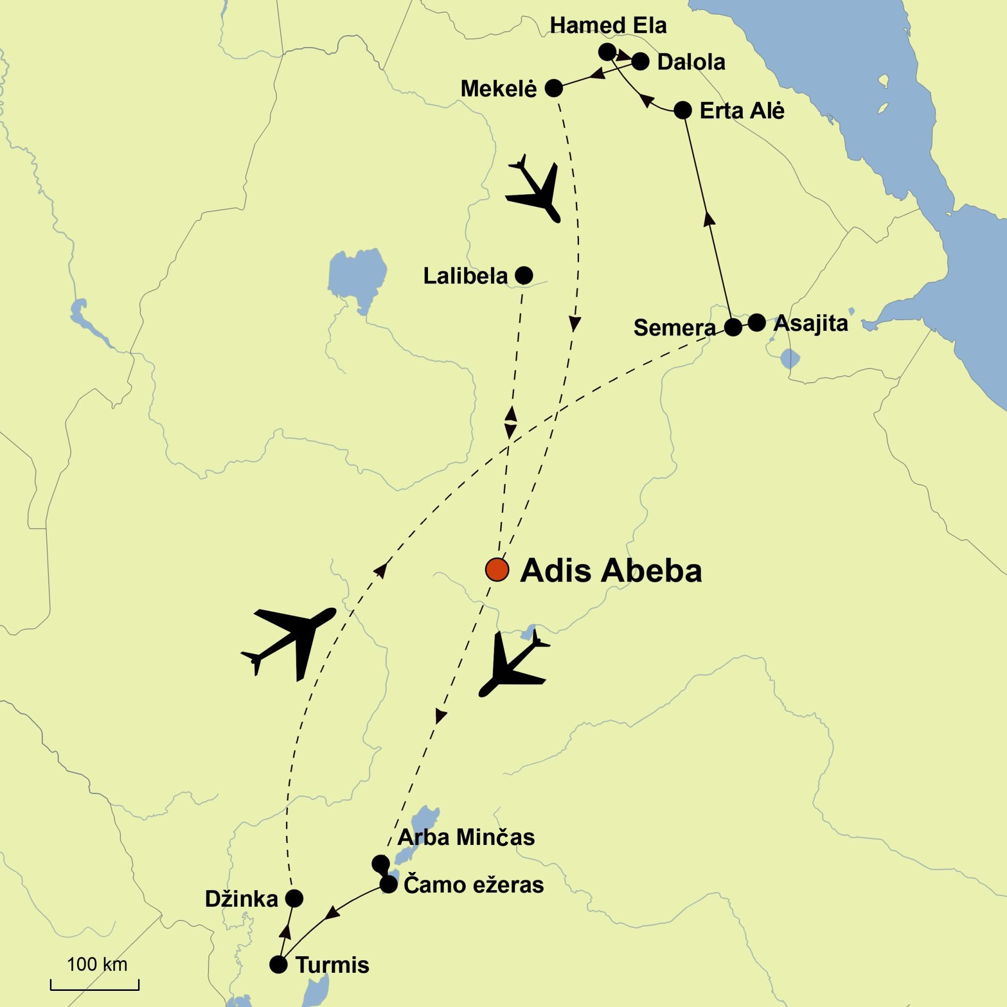 • Vietiniai skrydžiai Adis Abeba – Arba Minčas, Džinka – Adis Abeba – Semera,  Mekelė –Adis Abeba – Lalibela, Lalibela – Adis Abeba;