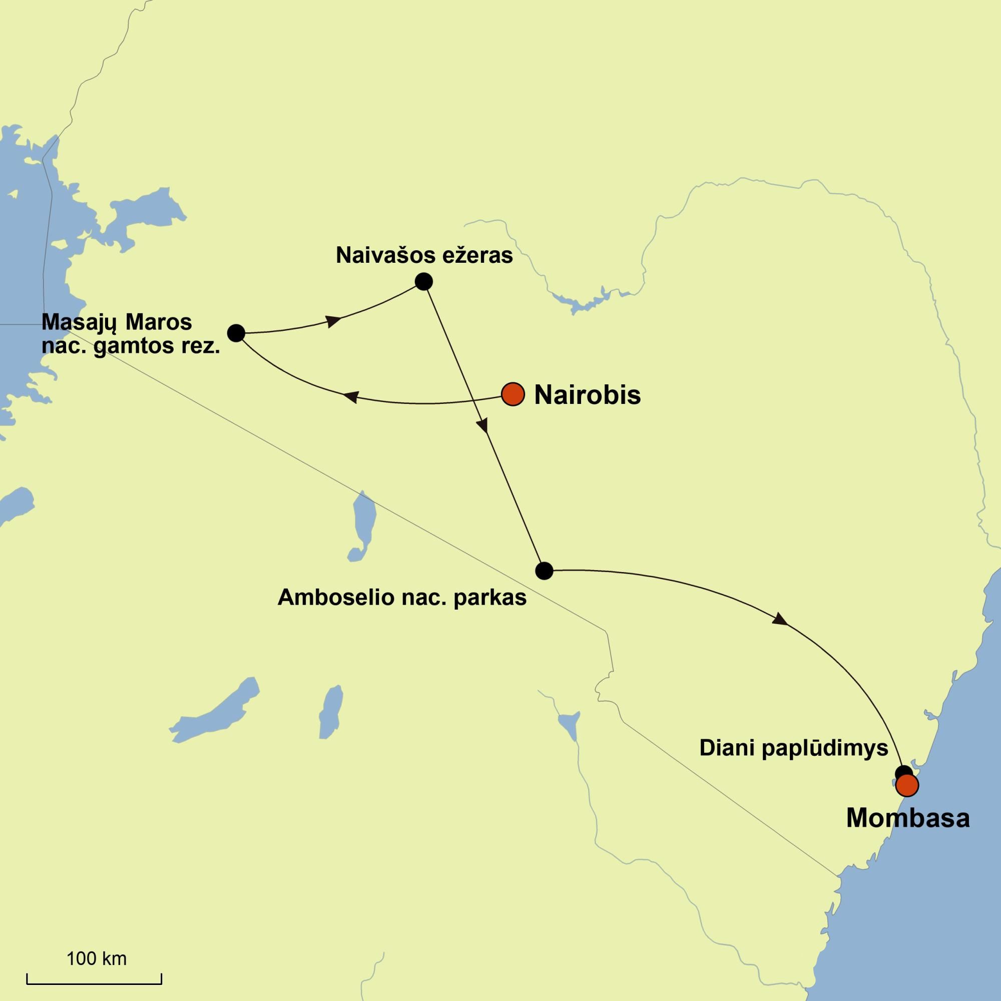 • Apgyvendinimas 4* žvaigždučių viešbučiuose ir lodžijose (11 nakvynių: 1 nakvynė Nairobyje, 2 nakvynės lodžijoje Masai Mara, 1 nakvynė lodžijoje prie Naivašos ežero, 2 nakvynės lodžijoje Amboselyje, 5 nakvynės Mombasoje);