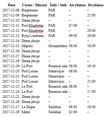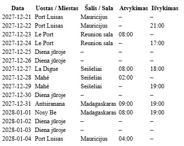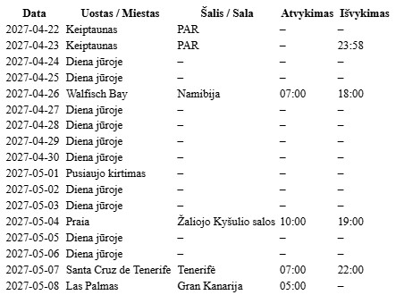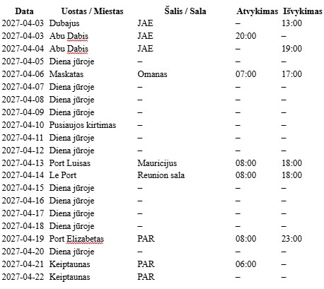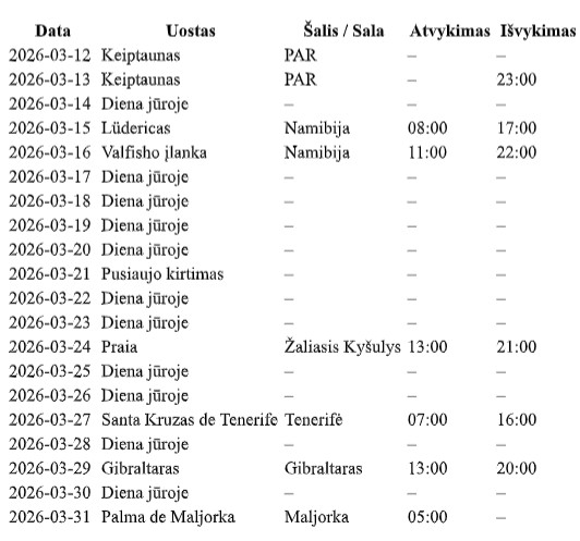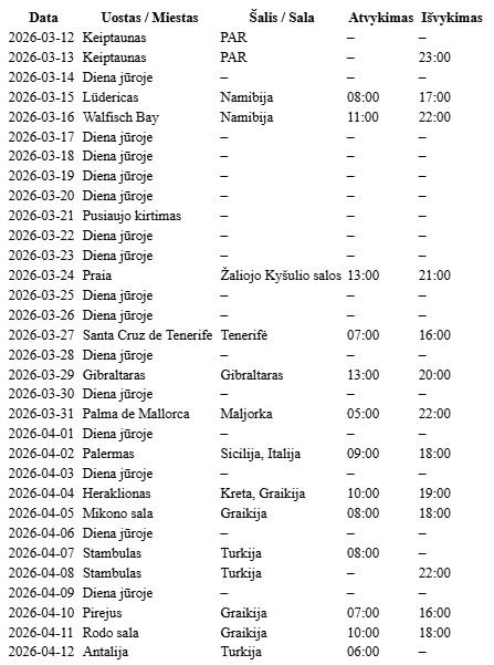Išvykimai: 2026 m. kovas – 2027 m. gruodis