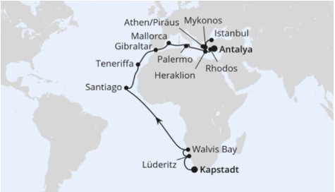 3) 32d/31n kruizas iš Keiptauno (PAR) iki Antalijos su AIDAstella nuo 2026 03 12