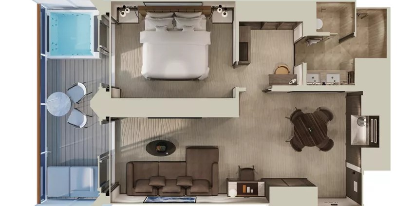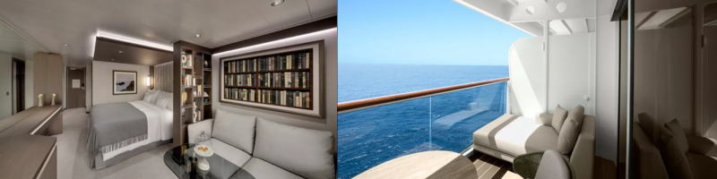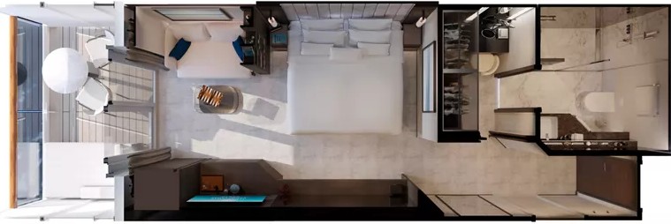 463 apartamentai, išsidėstę laivo išorėje, su panoraminiais langais nuo grindų iki lubų ir daugelyje kajučių – su privačiomis terasomis. Tai leidžia mėgautis neprilygstama jūros panorama tiek gyvenamojoje, tiek miegamojo erdvėje. Tai ne tik kajutė – tai jūsų privati jūros rezidencija, kur kiekviena detalė kuria nepakartojamą kelionės patirtį, leidžiančią jaustis namuose, net kai horizonte – begalinis vandenynas. Apartamentų dydis svyruoja nuo 35 m2 iki 280 m2 priklausomai nuo įsigytos kategorijos. Aprašome du variantus, tačiau rinktis galima iš daugiau.