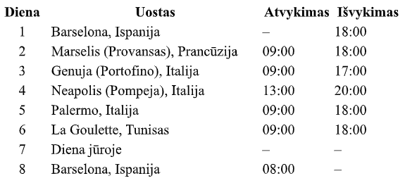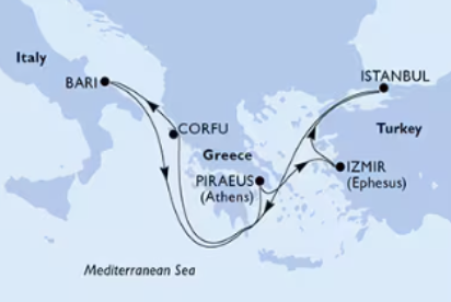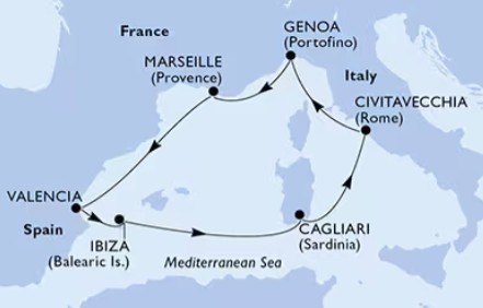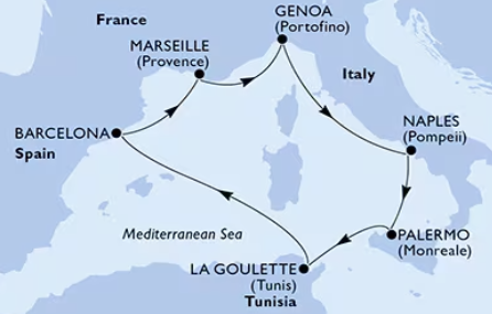 Atraskite istorijos ir kultūros lobius! Vienos kelionės metu aplankysite didžius istorinius miestus ir spalvingus Viduržemio uostus. Mėgaukitės šiluma, Viduržemio virtuve ir pramogomis laive – puiki kombinacija poilsiui ir įspūdžiams.