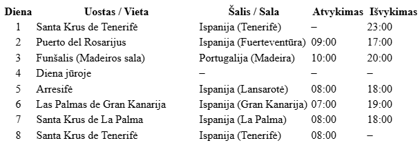 Išvykimas iš Santa Kruiz de Tenerifė gruodžio 13; sausio 03, 24, 31 ir vasario 07