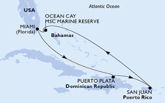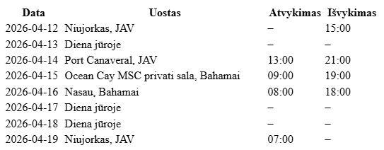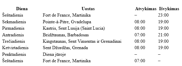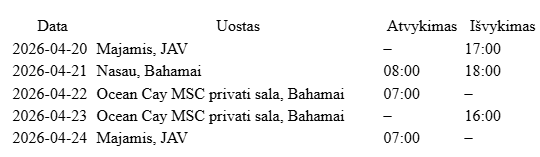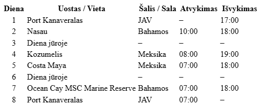 Išvykimas iš Majamio balandžio 20, 27; gegužės 4, 11, 18; spalio 5, 19, 26 d.