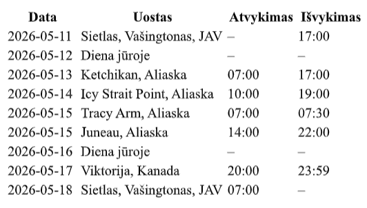 Išvykimai: 2026 m. balandis – 2027 m. kovas