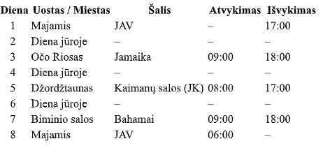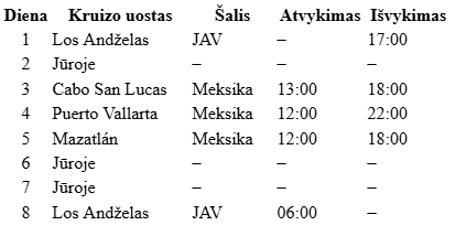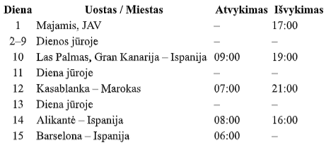Dėmesio: kainos pateiktos vienam asmeniui dvivietėje kajutėje pigiausia galima data. Kainos atnaujinamos rankiniu būdu, mūsų kelionių ekspertai patikslins ar kaina galioja ir ar yra laisvų kajučių Jūsų pasirinkta data. Atkreipkite dėmesį, kad keliaujant JAV amžius 21+