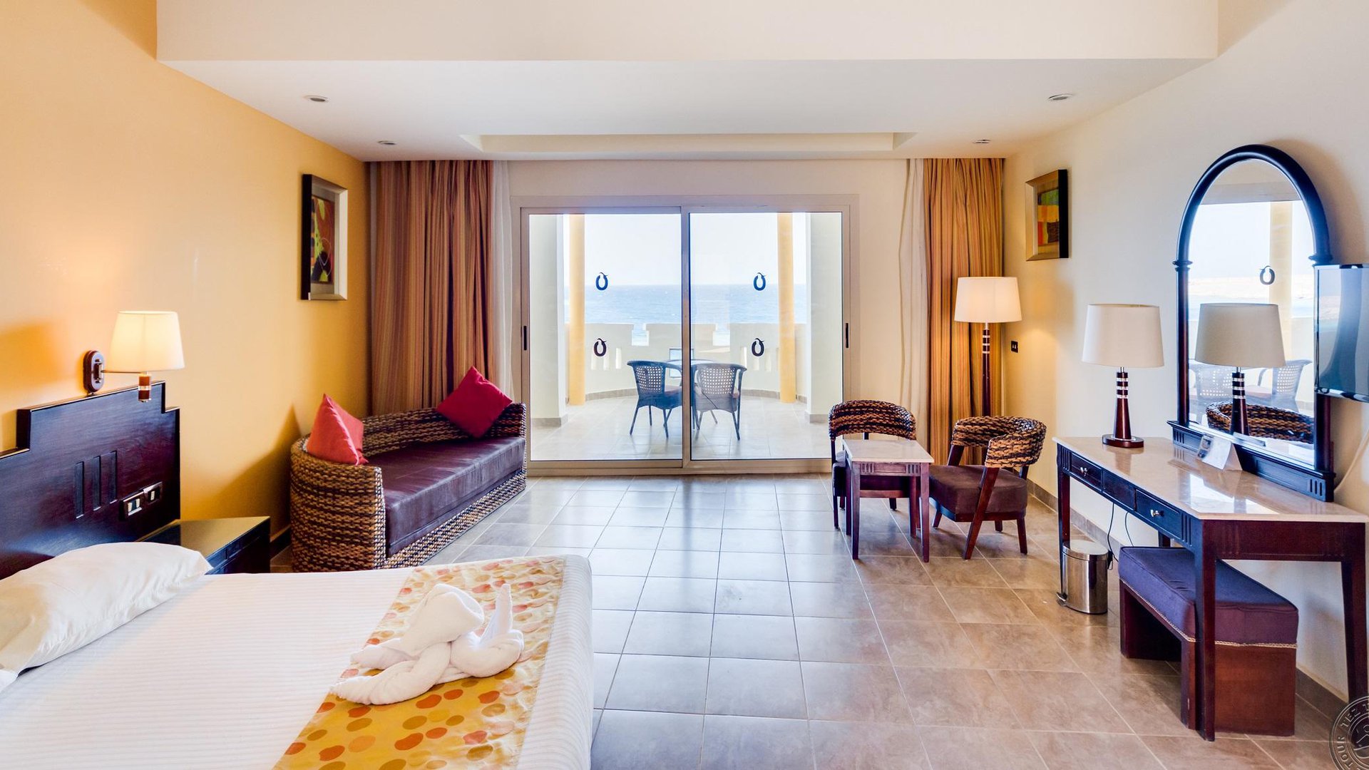 Royal Suite Sea Front tipo numeriai (maks. 4+1 asm., 85 m2 - miegamasis, svetainės zona su virtuve, įskaitant vonios kambarį ir balkoną/terasą).