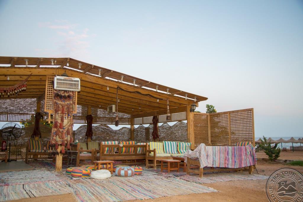 Apie 85 km iki Šarm aš Šeicho oro uosto, kurortiniame Dahabo mieste, Three Pools nardymo vietos teritorijoje, ant jūros kranto.