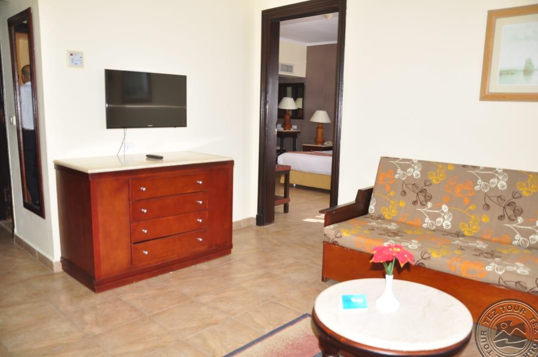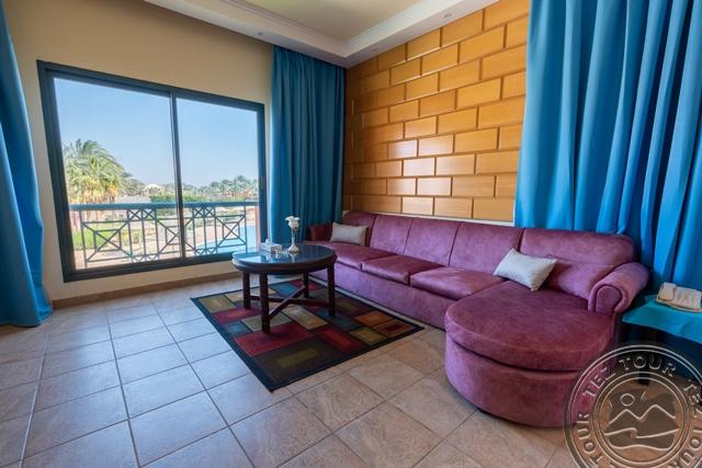 Junior Suite tipo numeriai (su vaizdu į baseiną, parką, maks. 2+2 / 3+1 asm., miegamasis su svetaine, vonia ir dušu, balkonas arba terasa, 73 m2). Papildoma lova - sofa-lova.