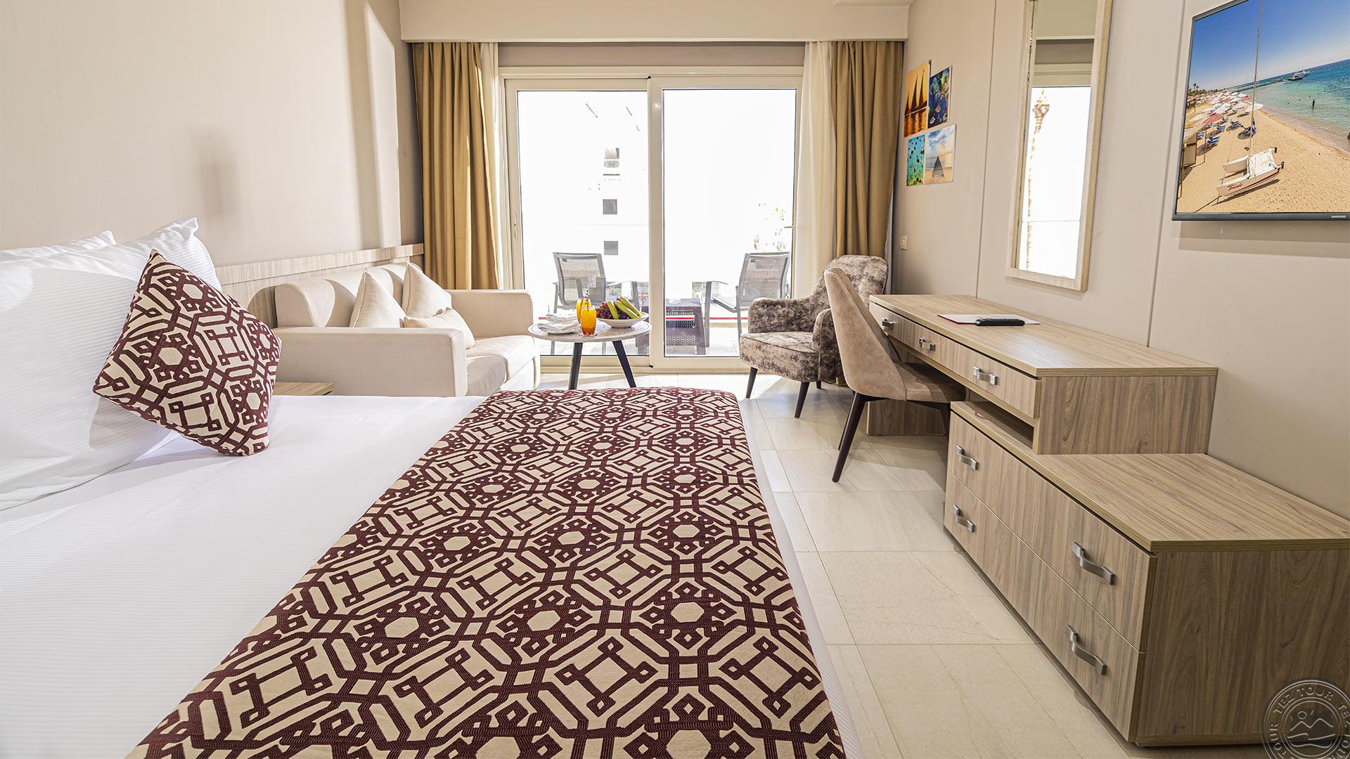 Royal Suite Beach front tipo numeriai (90 m2, miegamasis su dvigule ir dviejomis atskiromis lovomis, svetainė, mini virtuvėlė, vonios kambarys, trys balkonai).