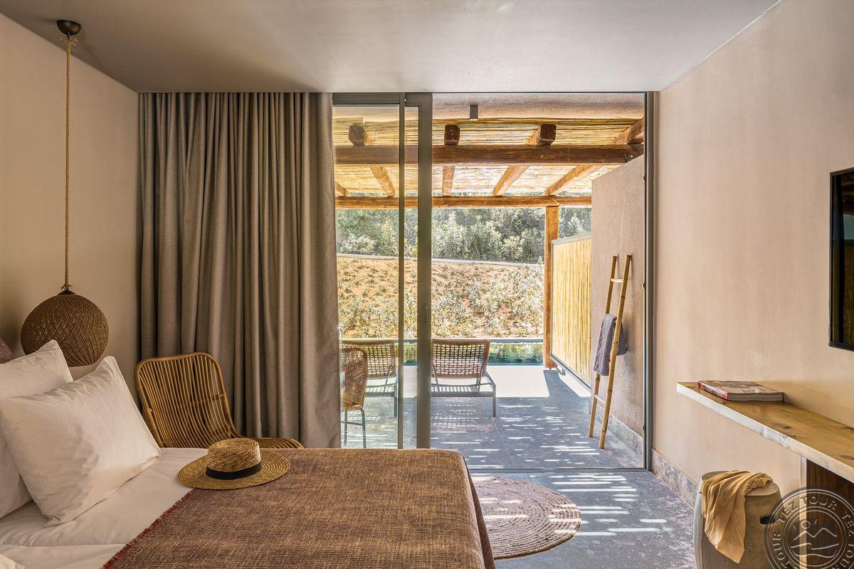 DOUBLE ROOM (BALCONY - POOL VIEW) - boho stiliaus numeryje yra dvigulė arba 2 atskiros lovos, atviro plano vonios kambarys su atskiru atogrąžų lietaus dušu ir tualetu, Wi-Fi, mini šaldytuvas.