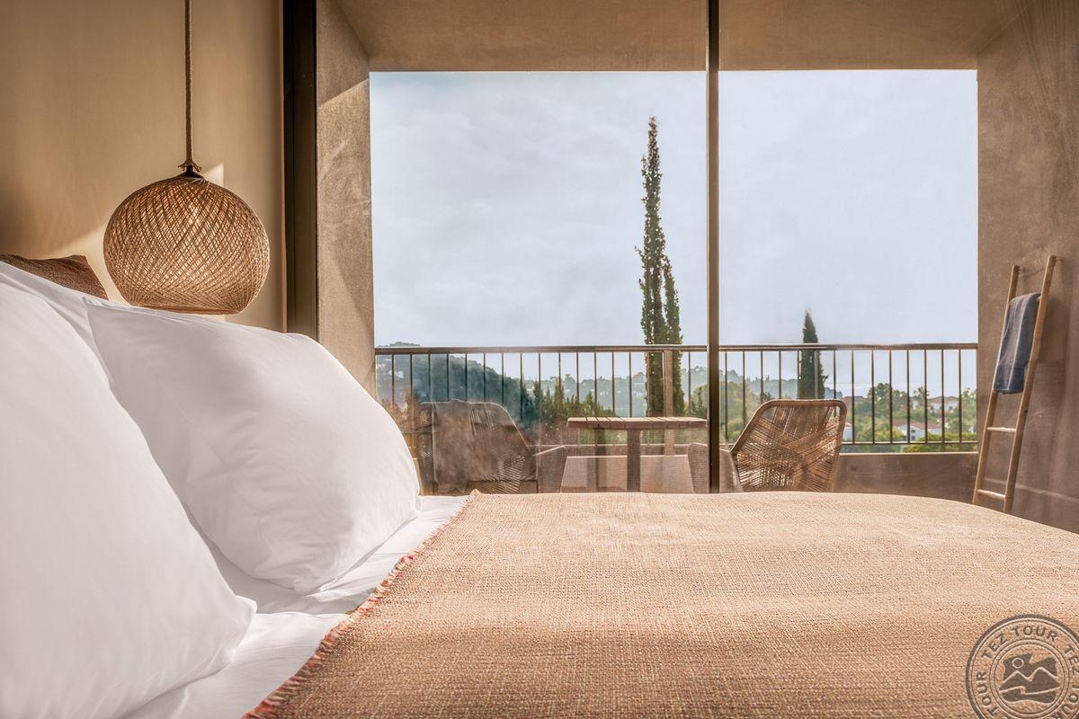 PANORAMIC DOUBLE ROOM (BALCONY - BAY VIEW) - boho stiliaus numeryje yra dvigulė arba 2 atskiros lovos, atviro plano vonios kambarys su atskiru atogrąžų lietaus dušu ir tualetu, Wi-Fi, mini šaldytuvas.