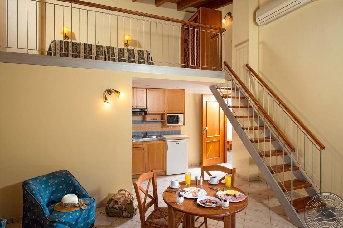 family maisonette 1 bedroom tipo numeris (2-jų aukštų atviro plano numeris, pirmame aukšte - miegamasis su dvigule lova ir atskira svetainė su sofa, antrame aukšte - miegamasis su dvigule lova, maks. 6 asm.).