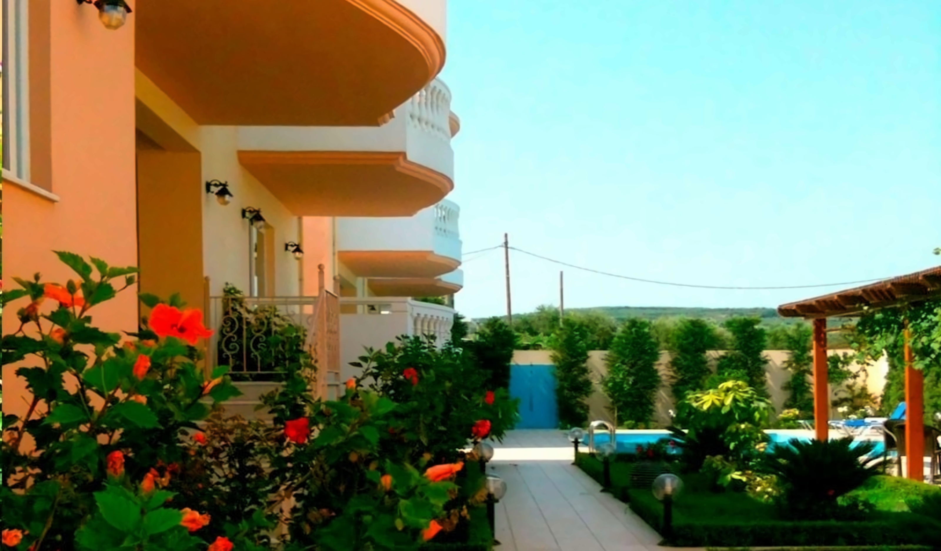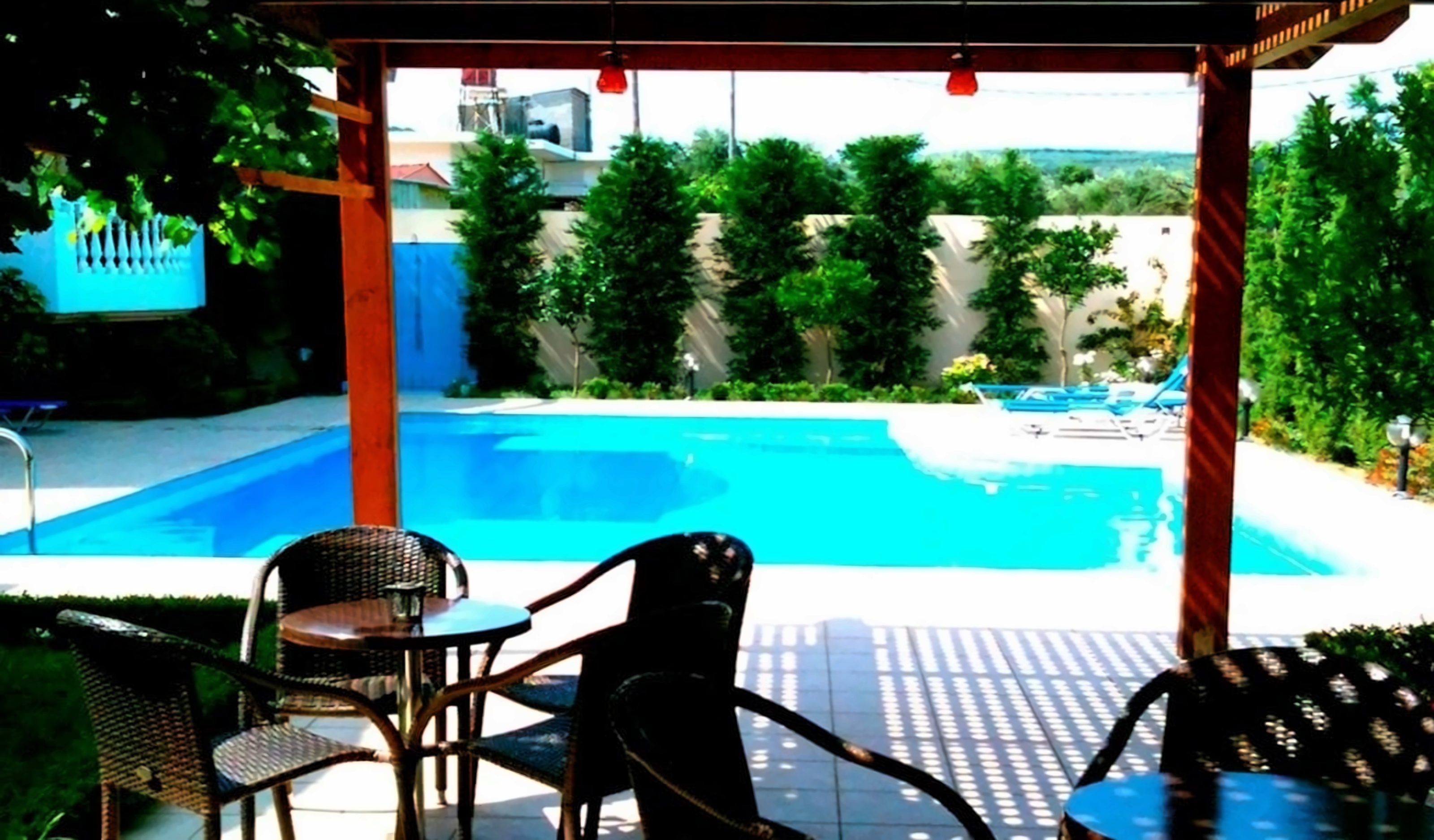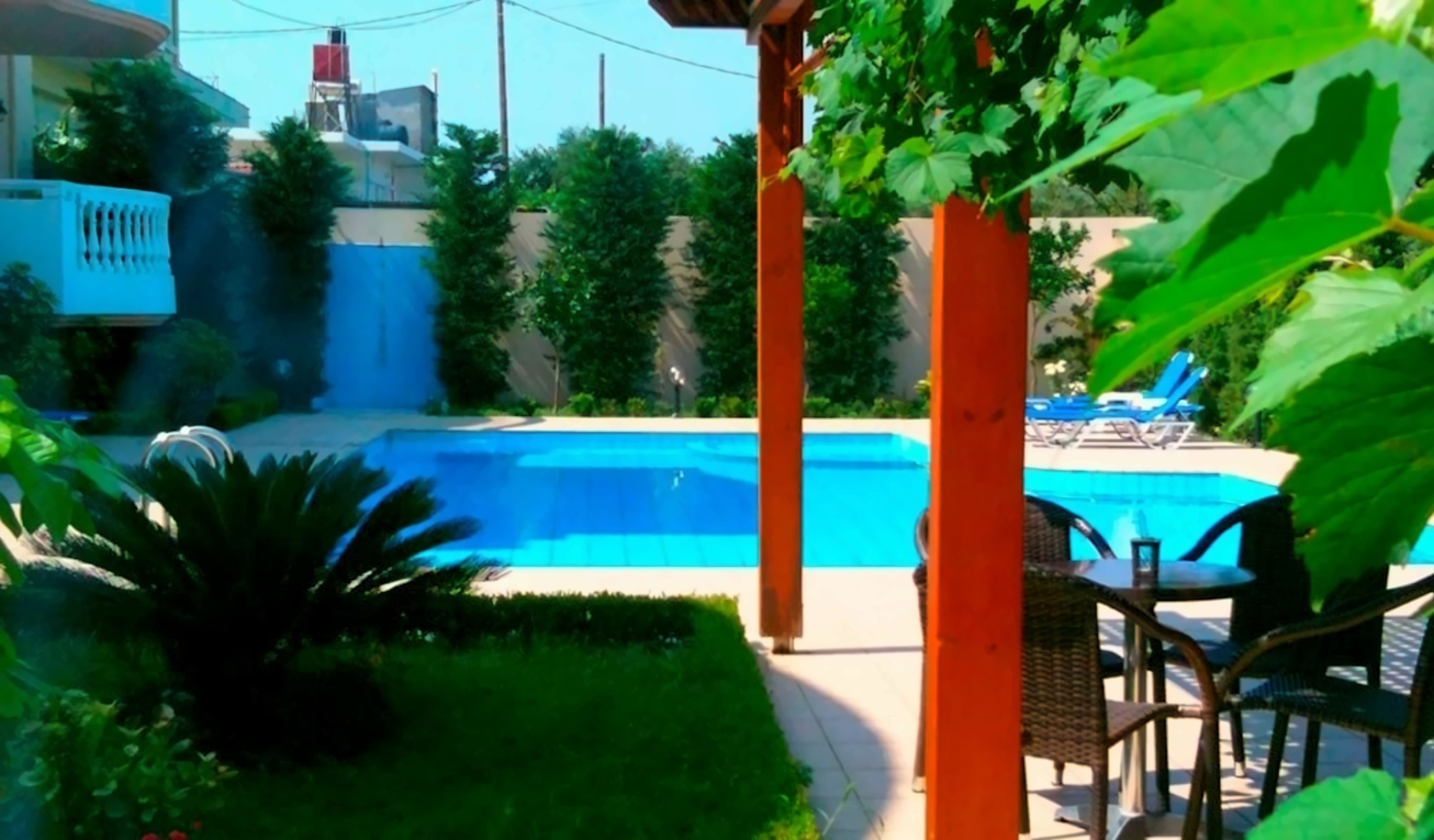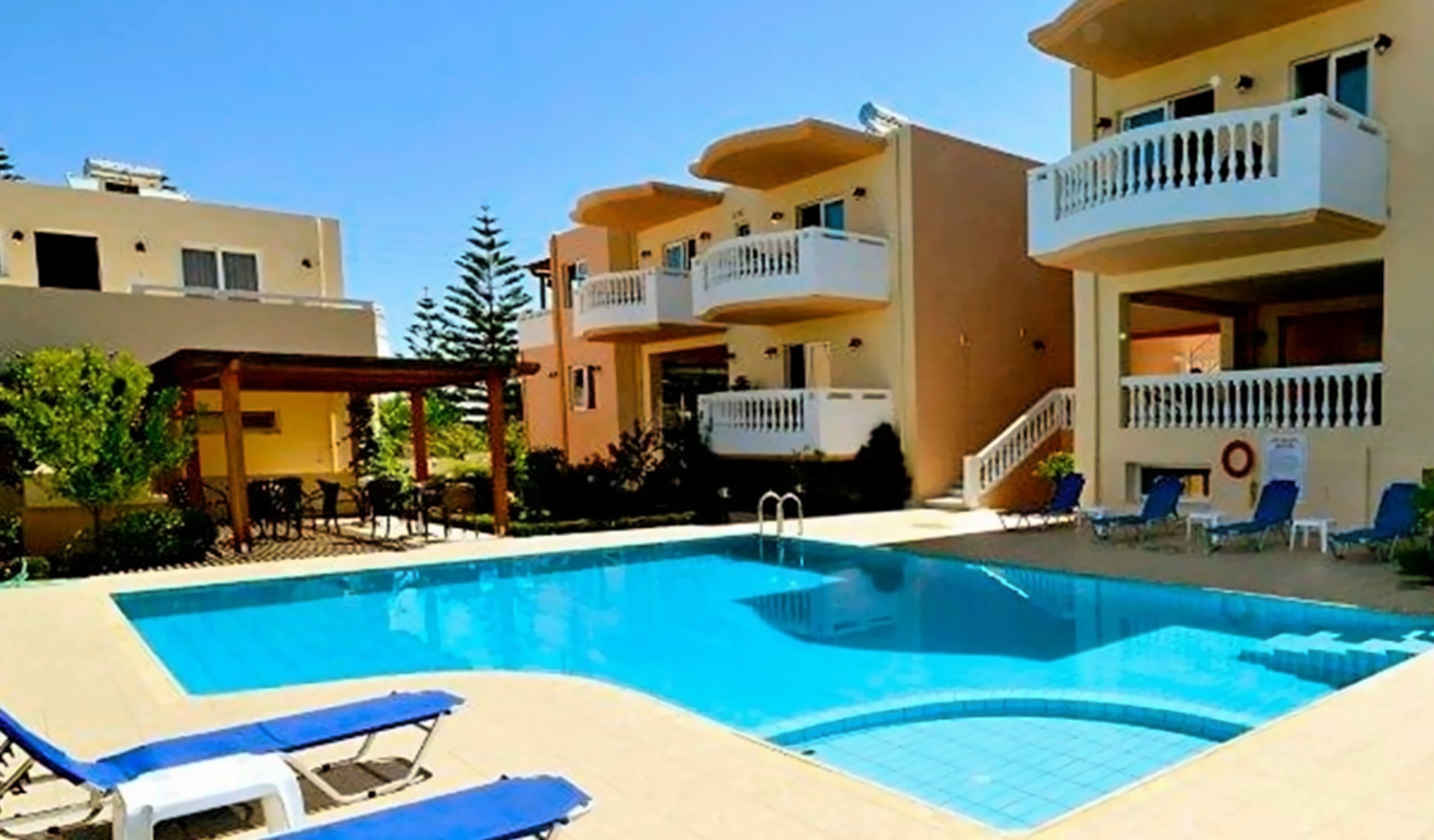 The hotel is located in the traditional village of Kamissiana on the west coast of Crete. It features an outdoor pool with a sunbathing area, sun loungers, and umbrellas, as well as a children's pool and green areas for relaxation. Guests have access to a restaurant and snack bar serving breakfast, drinks, and light snacks throughout the day, as well as a casual bar.