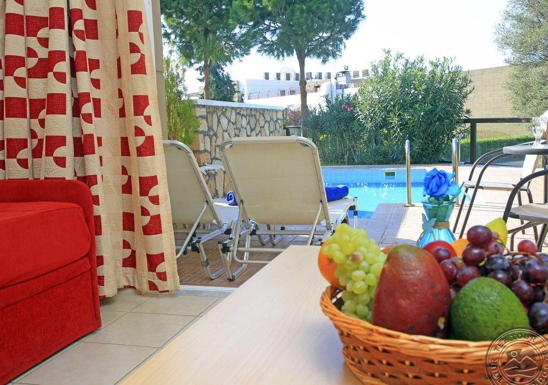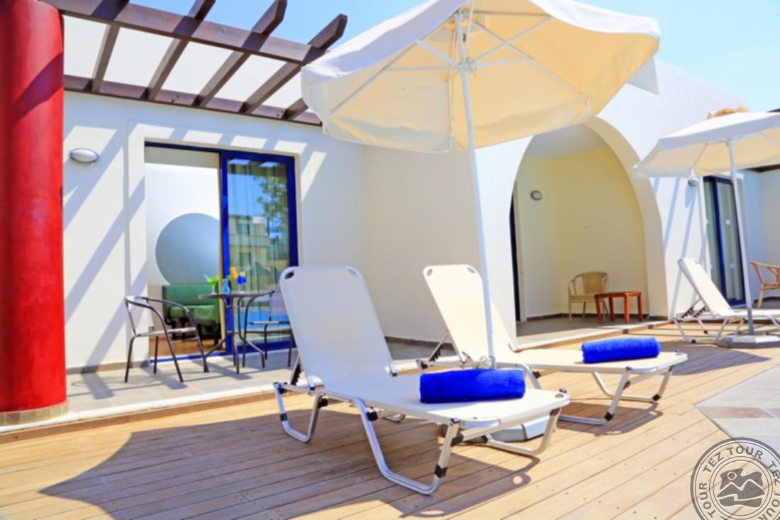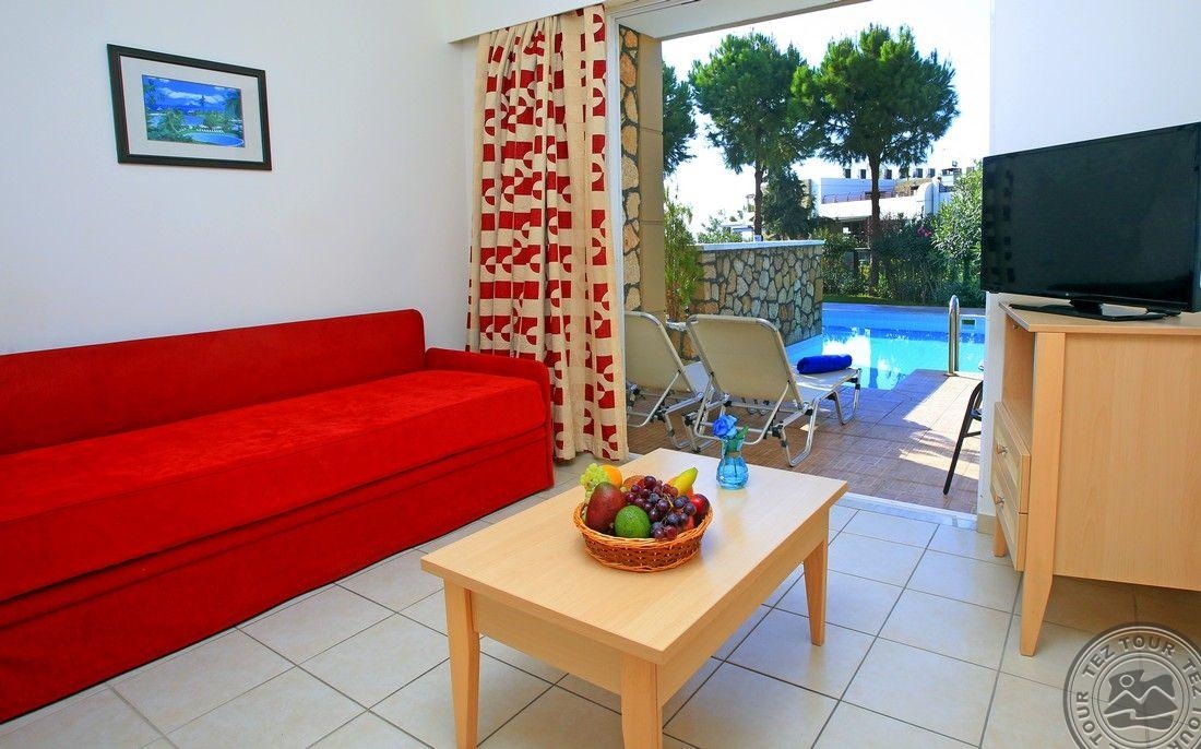 family room PV tipo numeriai (su vaizdu į baseiną, miegamasis ir svetainė atskirti durimis, pagrindinė lova – 2 viengulės lovos, papild. – sofa arba išlankstoma lova, išsidėstę prie baseino, maks. 3 + 1 asm., 30 m2);