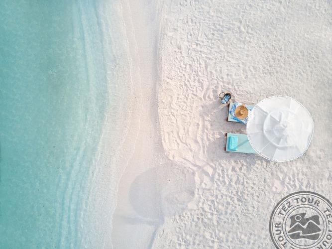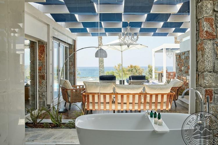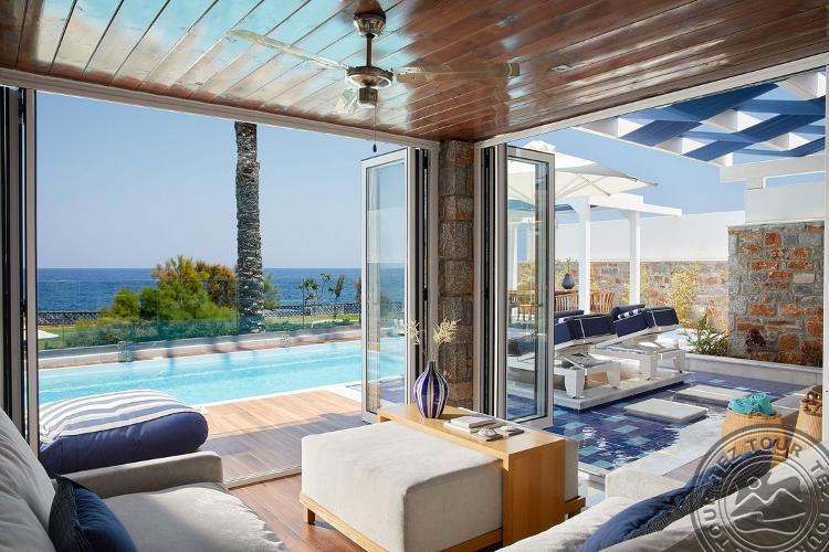 Beachfront Villa Privat Pool BF View tipo numeriai (atnaujinti 2021 m., su vaizdu į jūrą apatiniame aukšte, miegamasis su svetainės zona, dvigulė arba 2 viengulės lovos, papildomai – 2 sofos, individualus 24 m2 baseinas (šildomas už papildomą mokestį, pagal užklausimą), maks. 2+2 asm., 60 m2 + 50 m2 lauke).