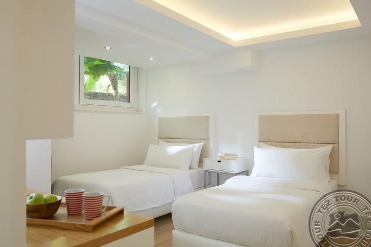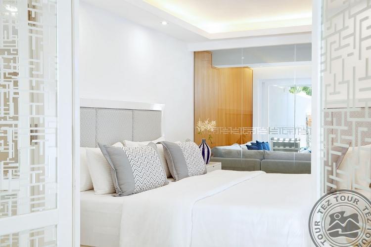 Signature Sharing Pool Fab.Sea View tipo numeriai (atnaujinti 2021 m., apgyvendinami tik suaugę asmenys, su vaizdu į jūrą, apatiniame aukšte, vieno kambario numeris, dvigulė lova, terasa, tiesioginis išėjimas prie baseino skirto 8 numeriams, maks. 2 asm., 36 m2 + 40 m2 lauke).