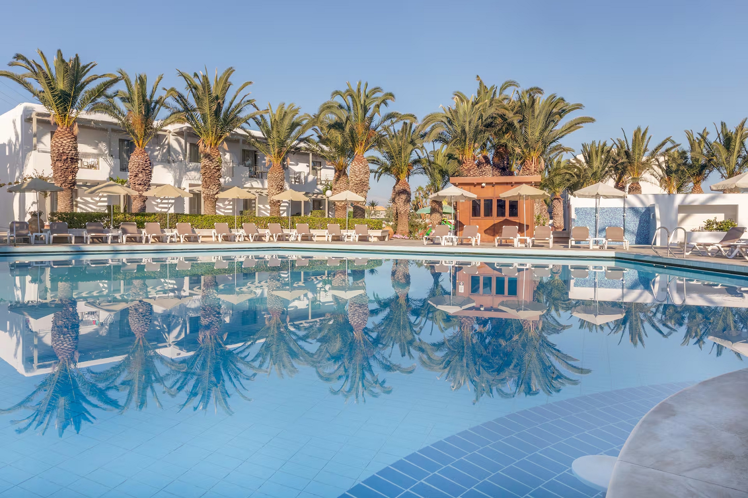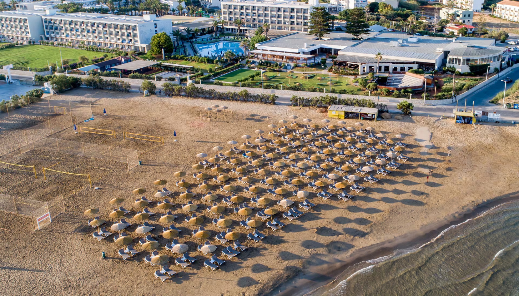 The hotel is located directly on the sandy beach in Gouves, Crete. It features several swimming pools, an indoor pool, a fitness center, and tennis courts. All-inclusive dining is offered in the main buffet restaurant; there is also an à la carte restaurant. Sports activities and evening entertainment are also available.