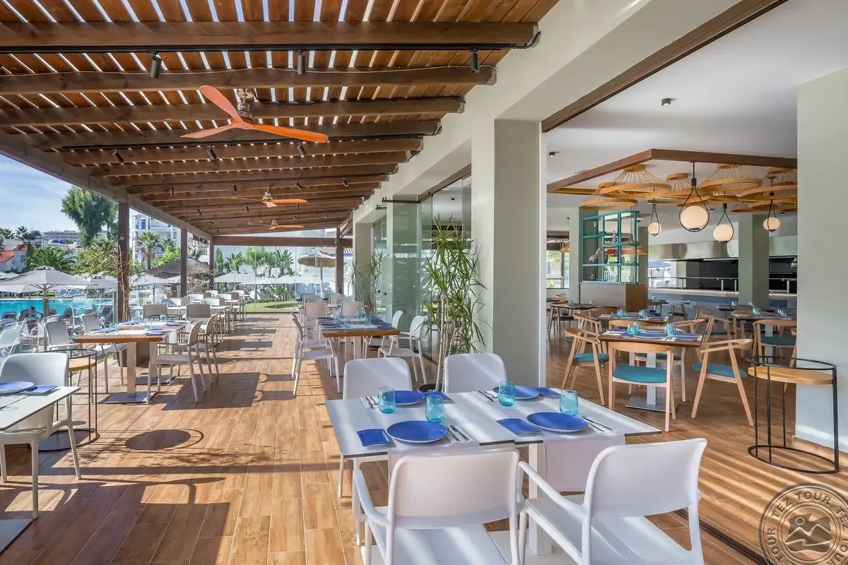 Didelis viešbutis, kuris turi labai didelę teritoriją. Viešbutis pritaikytas poilsiui su vaikais. Pagrindinis restoranas labai didelis, kaip valgykla. Pasibaigus pietums visada yra užkandžių baras. Horizontalus viešbutis. Nėra vieno didelio pastato, yra daug žema aukščių pastatų. Frontal sea view yra tik 8 kambariai, visi kiti neturi vaizdo į jūrą. 23 kambariai su daliniu vaizdu į jūrą. Matėme Standart kambarį. Parkingas yra 25 automobiliams. 15€ per dieną jeigu nori naudotis viešbučio parkingu. Iki vidurnakčio AI. Deluxe Family kambarį matėme. Deluxe Family turi duris, kurios skiria kambarius.