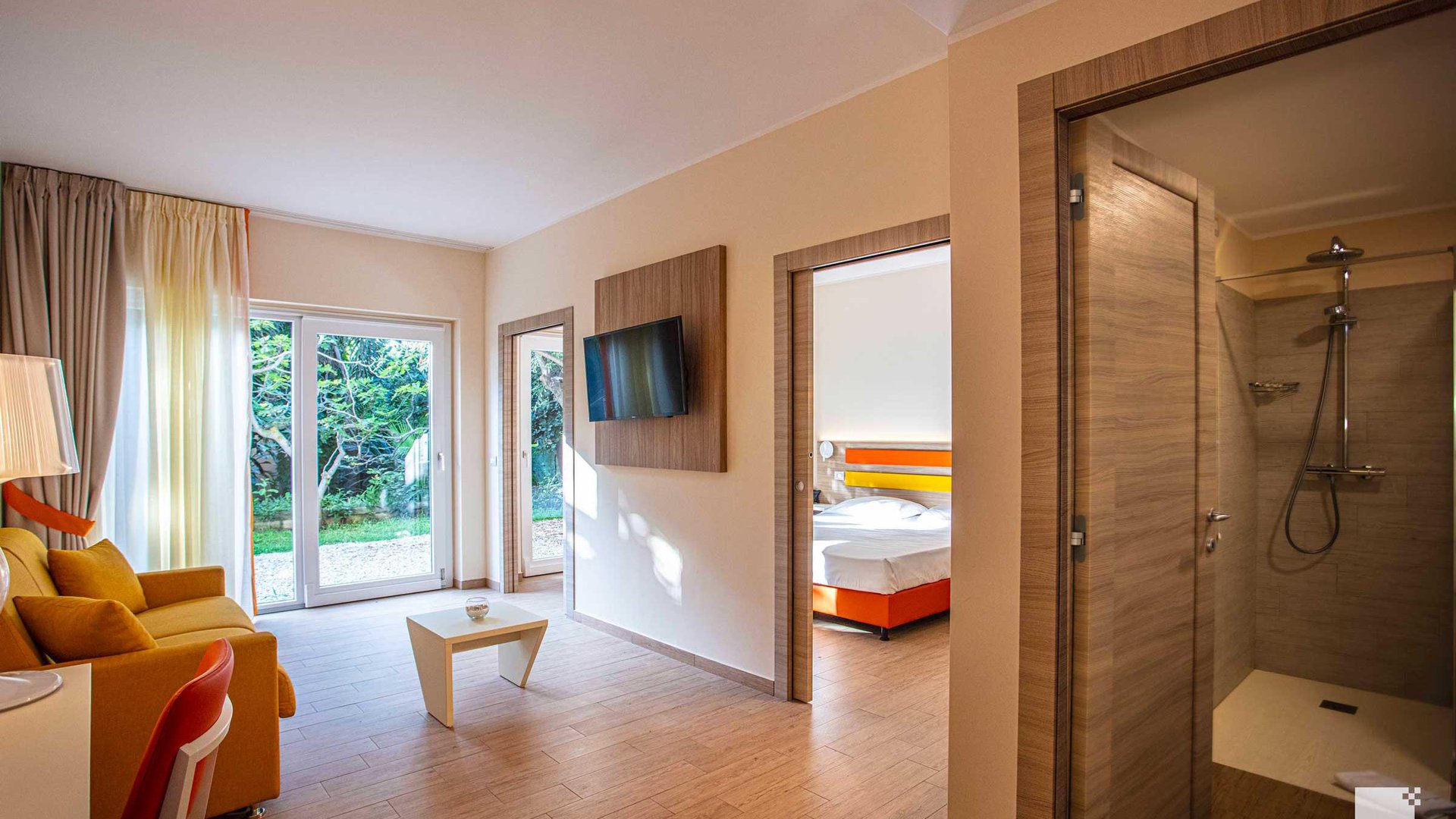Junior Suite tipo numeriai (su vaizdu į sodą, pirmame aukšte, miegamasis su svetainės zona, dvigulė arba 2 viengulės lovos, sofa-lova, Smart-TV, nedidelis sodas, maks. 2+2 arba 3 asm., 35 m2).