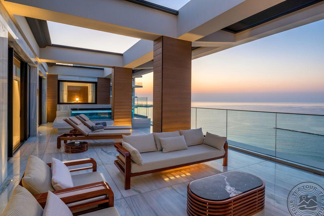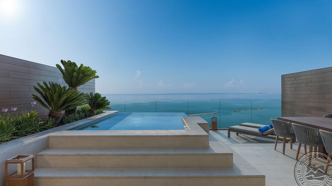 • Roof Top Duplex Suite with Private Pool tipo numeriai (maks. 2 asm., 110 kv. m., dviejų aukštų numeriai (miegamasis ir svetainė), išsidėstę pagrindinio pastato viršutiniame aukšte, vonios kambarys, terasa su vaizdu į jūrą, šio tipo numeriai skirti tik suaugusiems);