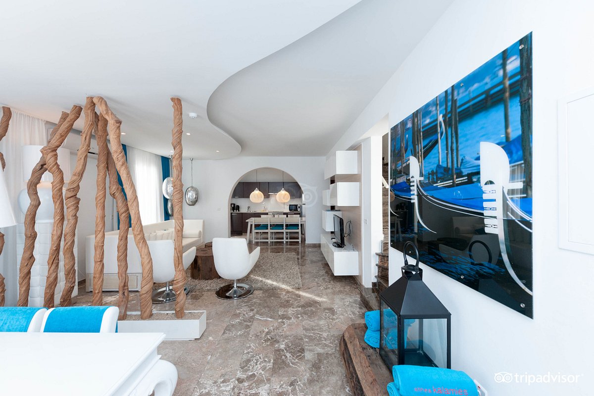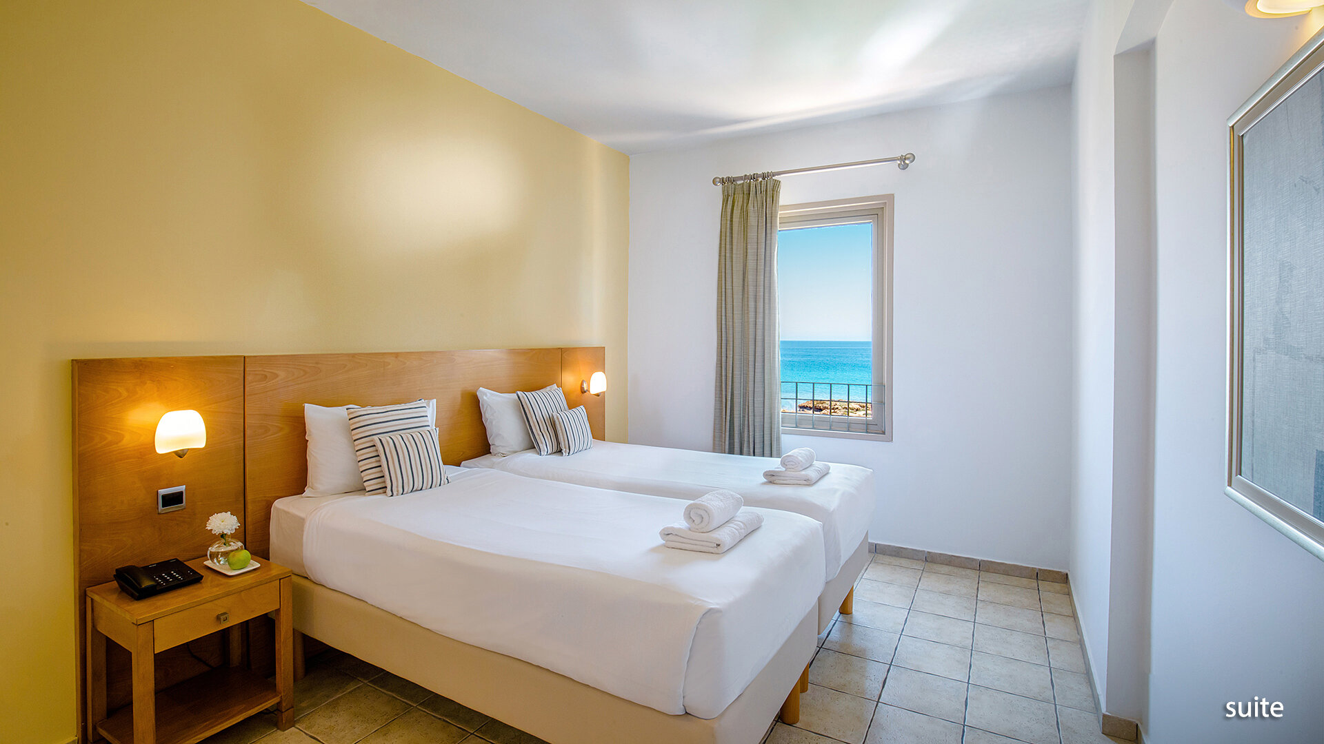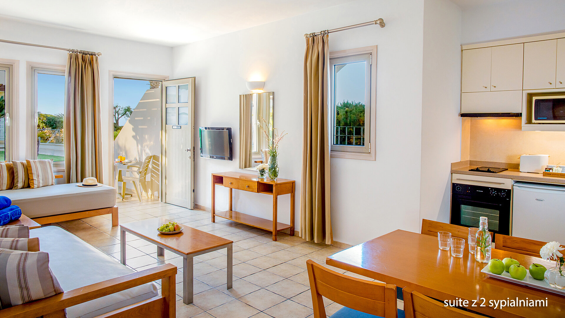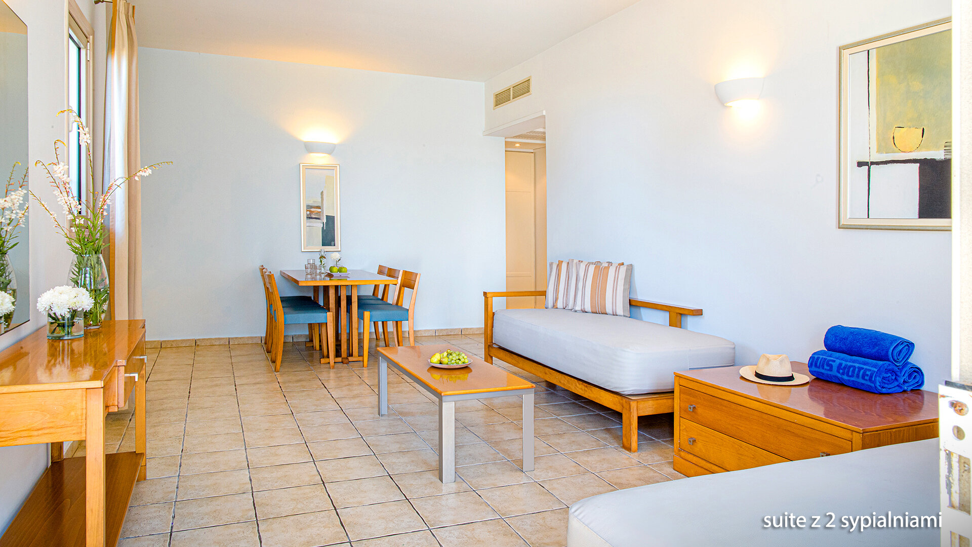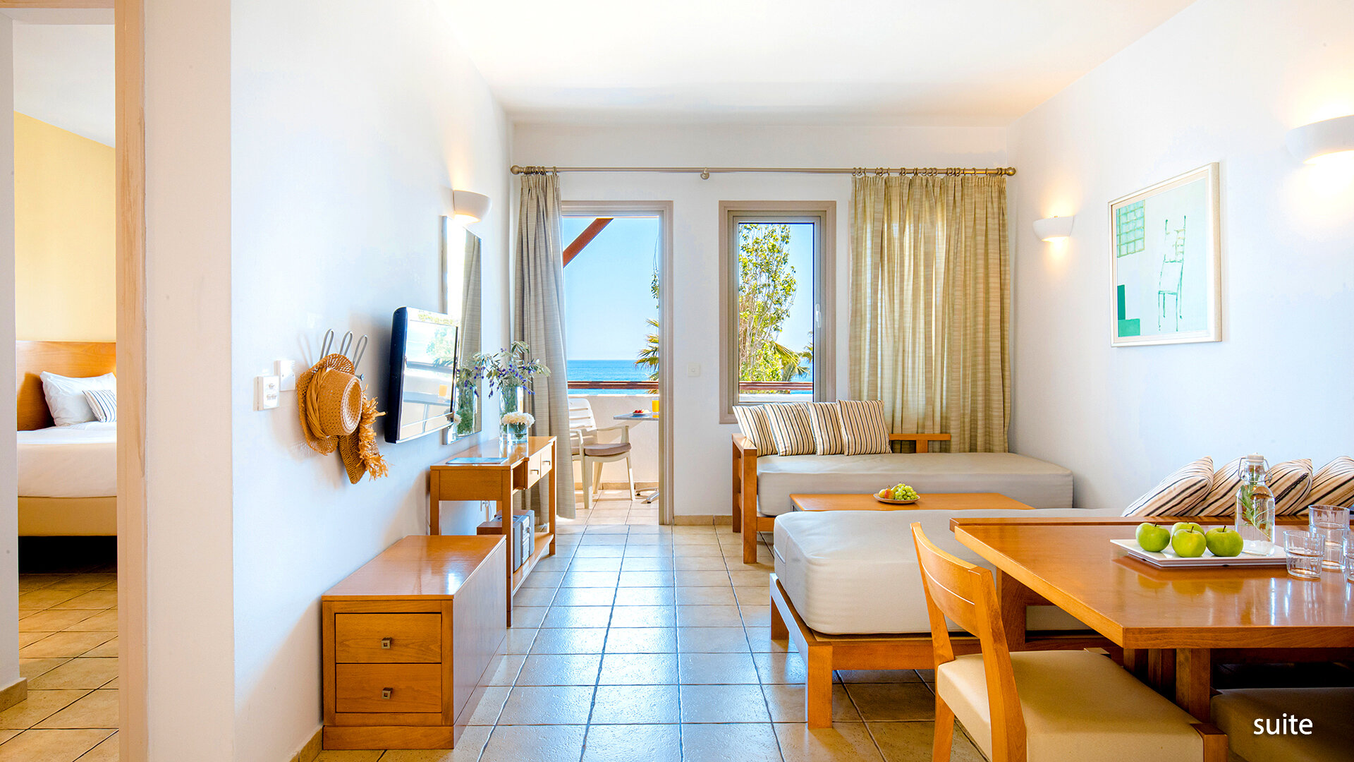 • One-Bedroom suite (maksimaliai 4 asmenims, 1 miegamasis, svetainė su virtuvėle, 2 vienulės ir 2 sofos, su bakonu/terasa ir vaizdu į jūrą/gyvenvietę/baseiną, 42 m2)