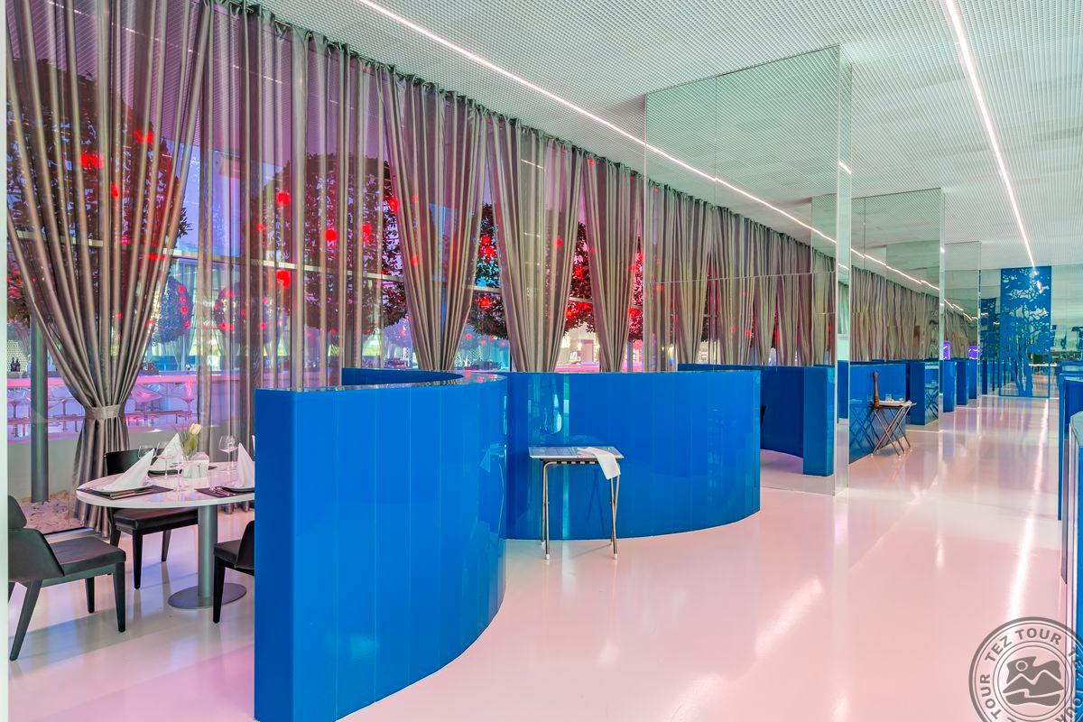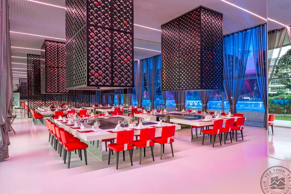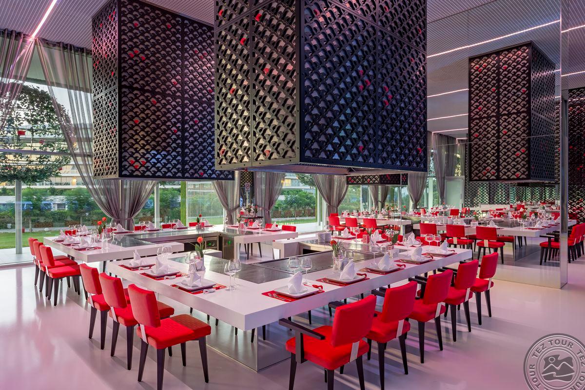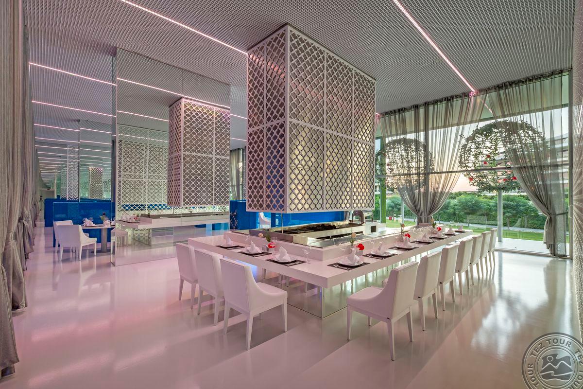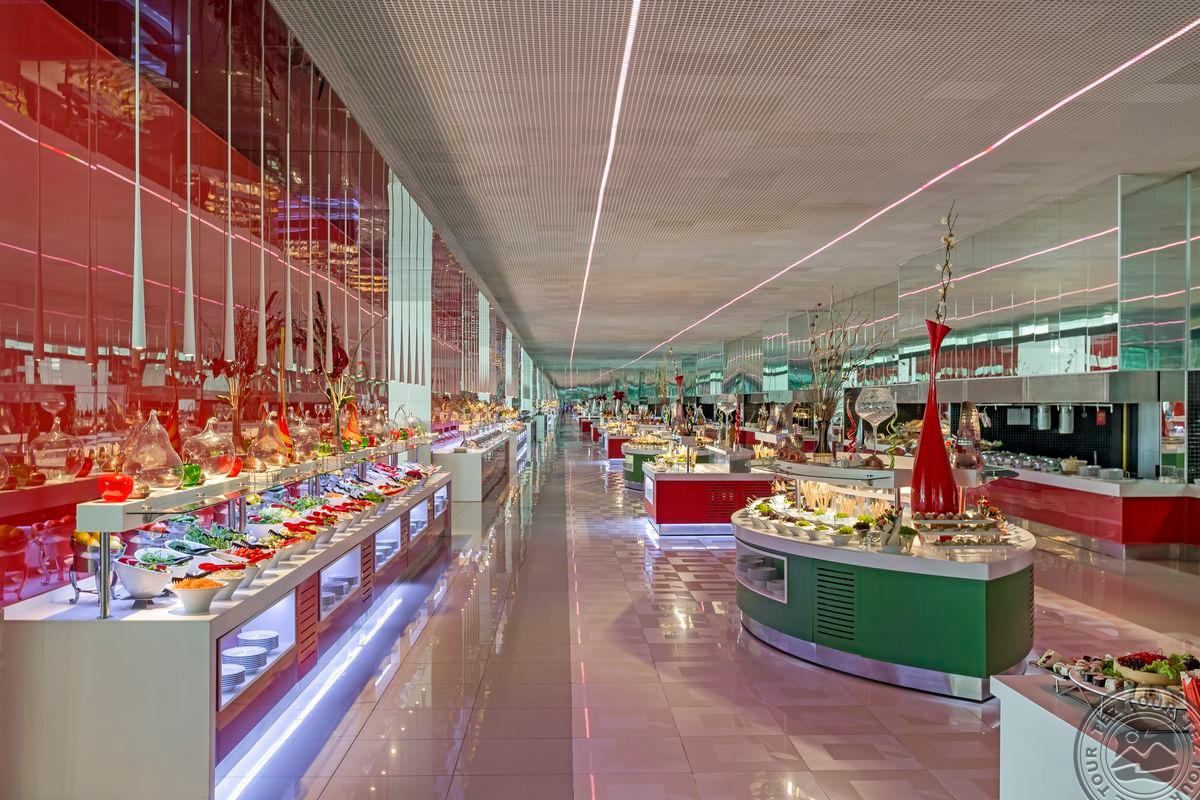 • a la carte restoranai: 7 (turkiškas, žuvies, italų - rezervacijos mokestis; tarptautinis, sušio, afrodiziako, restoranas Blind (vakarienė tamsoje) - pagal išankstinę rezervaciją, už papildomą mokestį, pagal meniu, dirba pakaitomis)