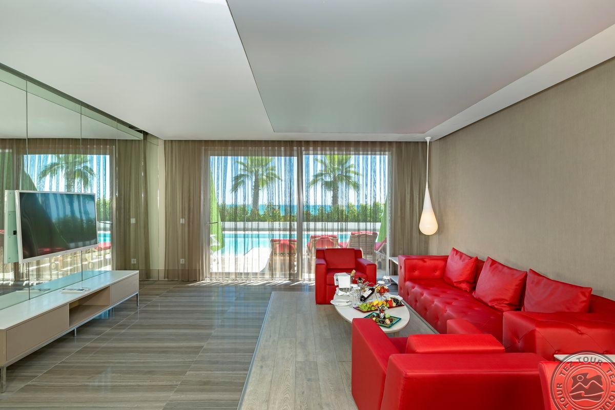 4 keturių kambarių Presidential Villa tipo numeriai (svetainė, 3 miegamieji, baras, virtuvė, 2 saunos, 3 garinės dušo kabinos, nuosavas sodas (500 m2), privatus baseinas (80 m2), maks. 6 asm., 600 m2).