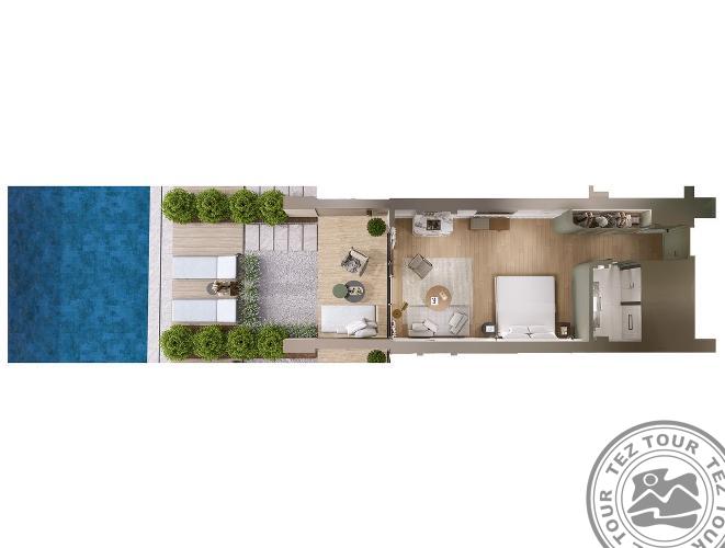 2 Junior Suite tipo numeriai (svetainė, miegamasis, dvigulė lova arba 2 atskiros lovos, maks. 4 asm., 107 m²);