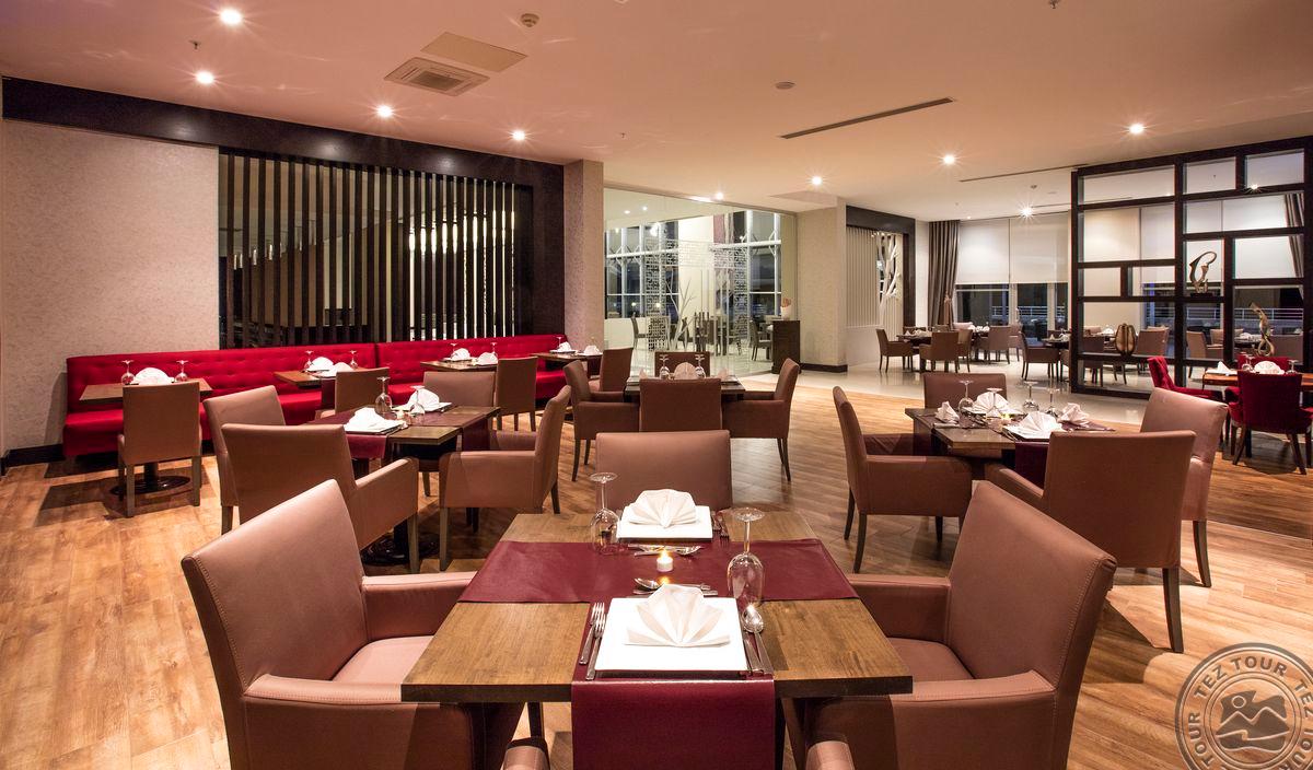 • a la carte restoranai: 3 (italių, turkiškas, jūros gėrybių - gyvenant ne mažiau nei 7 naktys kiekviename restorane vieną kartą galima apsilankyti nemokamai; restoranas Theos bokšte - tarptautinė virtuvė, pagal išankstinę rezervaciją, rezervacijos mokestis)