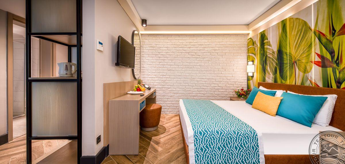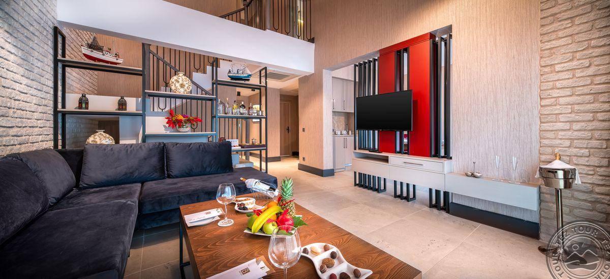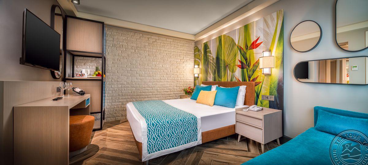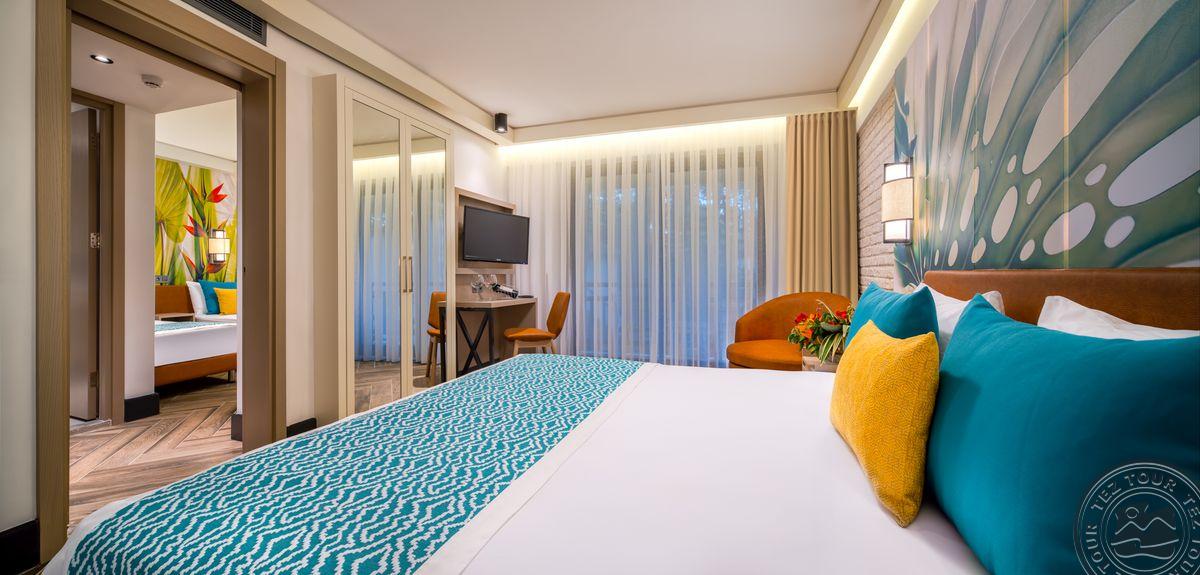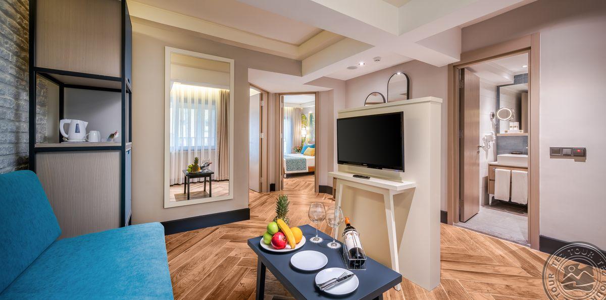 14 Family suite tipo numerių (atstumas iki paplūdimio 100 m, svetainė, 2 miegamieji atskirti stumdomomis durimis, dvigulė ir 2 viengulės lovos, 2 vonios kambariai, prancūziškas balkonas arba terasa, maks. 5 asm., 37-46 m2).