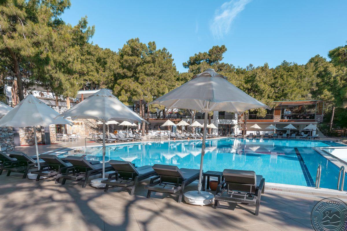 Už viešbučio teritorijos niekur neišeisi, randasi gamtoje, turi pagrindinį pastatą ir vasarnamius, kuriuos ir rekomenduoju rinktis, jie pušyne, turi dideles terasas. Standartiniai kambariai turi tik prancūziškus balkonus, net renovuoti 2022 žiemą, o vasarnamiai prieš 3 metus. Teritorija prižiūrėta ir jauki. Mini baras su soft gėrimais, paskui pildomas tik vandeniu. 3 a la carte, vienas nemokamai. Turi vandens kalnelius. Turi normalų amfiteatrą pasirodymams. Po teritoriją vežioja golfo mašinos. Tikrai jaukus ir geras variantas. Skirtas šeimų poilsiui.