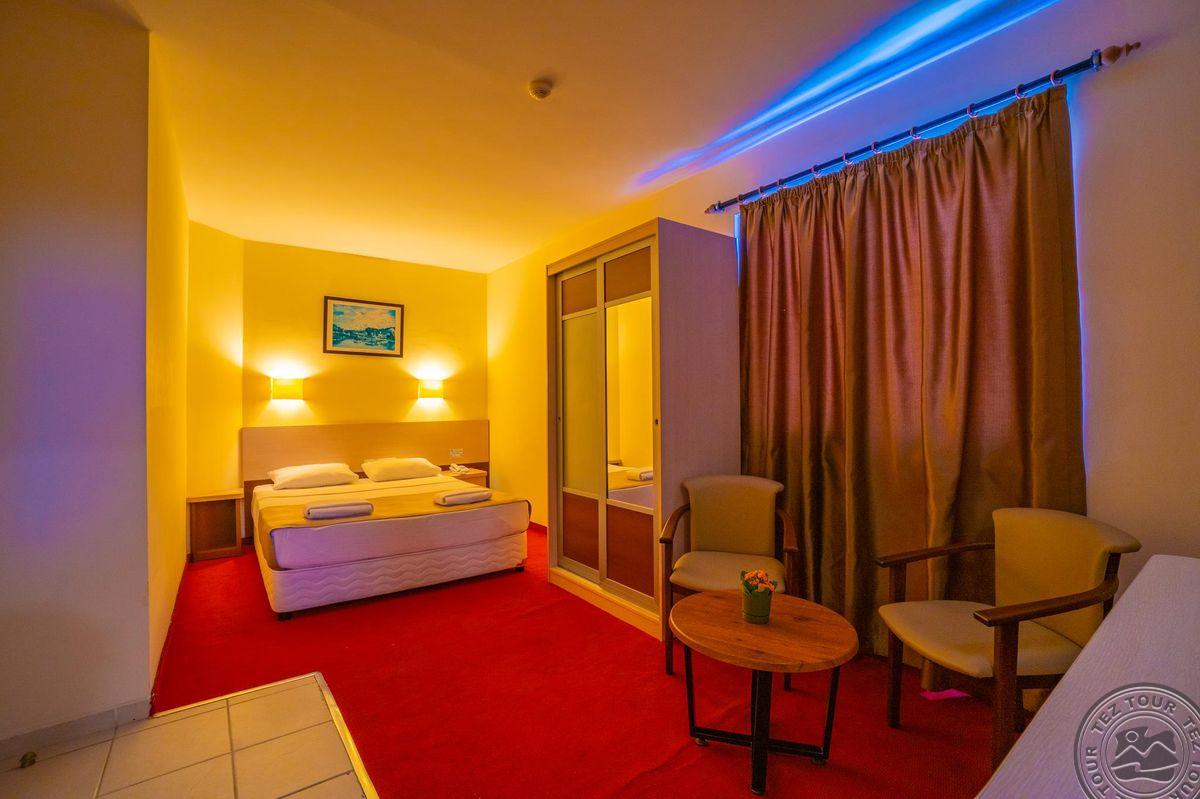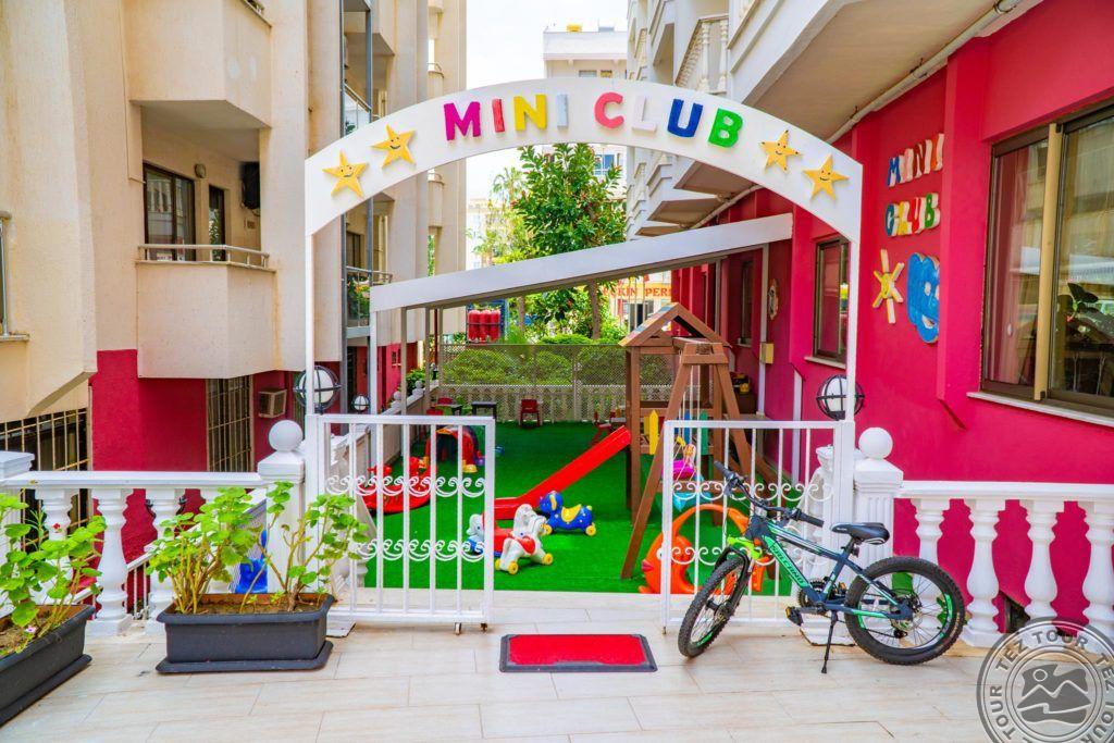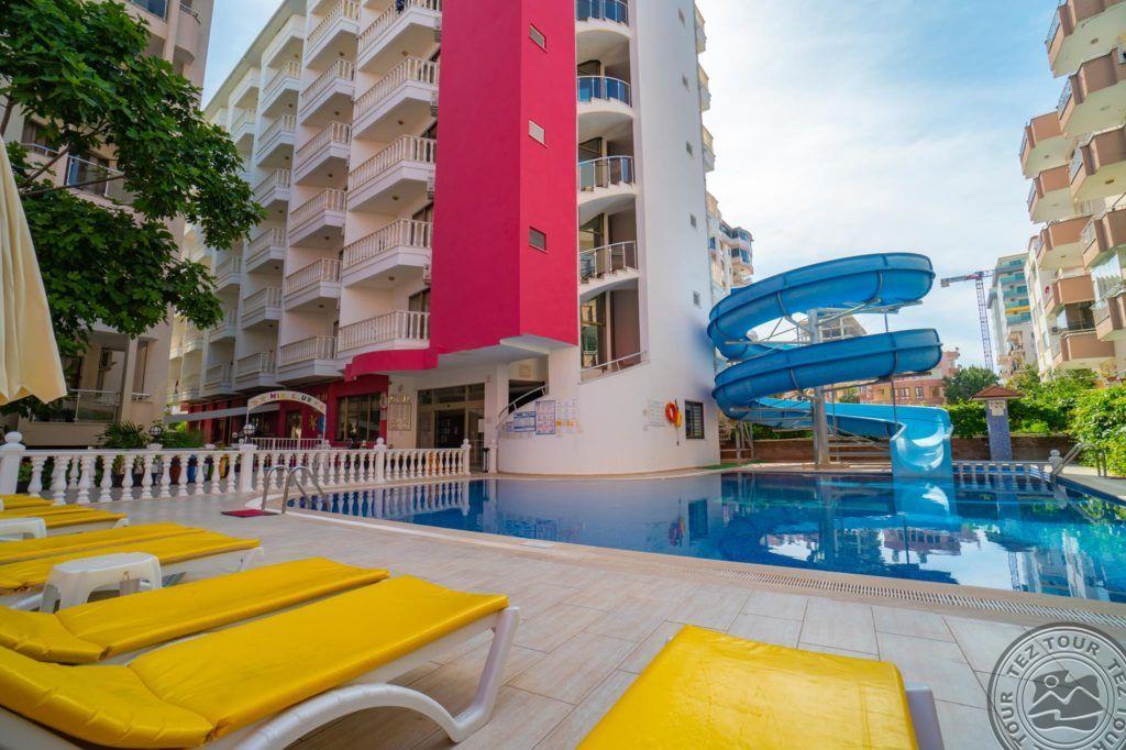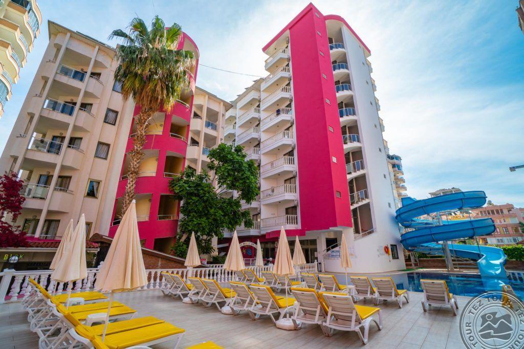 Labai išvargino kelionė autobusu nuo oro uosto iki viešbučio - virš 3 valandų autobusu. Ta pati situacija ir vykstant į oro uostą. Viešbutis pranoko lūkesčius. Internete yra daug blogų atsiliepimų, bet asmeniškai su jais nesusidūriau. Atitinka ekonominį 4* įvertinimą. Vykau su dukra, bet gavome puikų trivietį kambarį "B" bloke, kuriame net kartais veikė wifi. Sterilus dušas, puikiai veikiantis kondicionierius, švari patalynė, tik rankšluosčiai kiek papilkėję. Maistas skanus ir kokybiškas, kartais susidaro eilės, bet tik dėl žmonių žioplumo, nes vienodas maistas tiekiamas dviejose vietose. Daug turkiškų desertų, iš vaisių tik slyvos ir obuoliai. Personalas labai paslaugus ir neįkyrus. Laisvai kalba anglų, rusų kalbomis. Pirmą dieną pasitiko Marco, kuris suteikė išsamią informaciją apie viešbučio paslaugas, aplinką, turgaus dienas, kaip nuvykti į Alaniją ir pan. Dienomis prie pagrindinio baseino vyksta žaidimai, o vakare pramoginiai renginiai, vaikų diskoteka. Vedėjas kalba anglų, rusų, vokiečių, turkų kalbomis. 10:15val. atsirado vaikų mini klubas. Tam tikromis valandomis veikia čiuožykla prie mažojo baseino. Prie jūros yra baras, nuo ~11:20val. būna užkandžiai. Pleže yra wc, dušai, geriamas vanduo. Priėjimas prie jūros šiek tiek status, bet vaikui tai nebuvo problema. Vėliau krante pridėjo smėlio maišų, kad būtų nuožulniau. Atokiau nuo gultų daug žvejojančių žmonių. Atsivežkite savo pležo rankšluosčius, nes viešbutis jų neturi. Viešbutyje renkasi labai įvairių tautybių turistai. Daug kačių, bet jų pilna visoje Mahmutlaro gyvenvietėje. Dieną prieš išvykimą galite paprašyti, kad paruoštų pusryčių dėžutes. Pirkau paskutinės minutės pasiūlymą ir likau labai patenkinta. Vienintelis minusas - kelionė iš oro uosto iki viešbučio, kuri truko virš 3val. Tad rekomenduoju pirkti kelionės paketą, kuris siūlo skrydį į Gazipažos oro uostą (tik 31km.). Ačiū organizatoriams ir sėkmės darbuose. :)