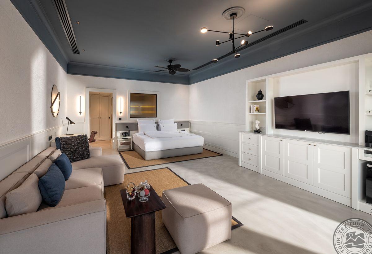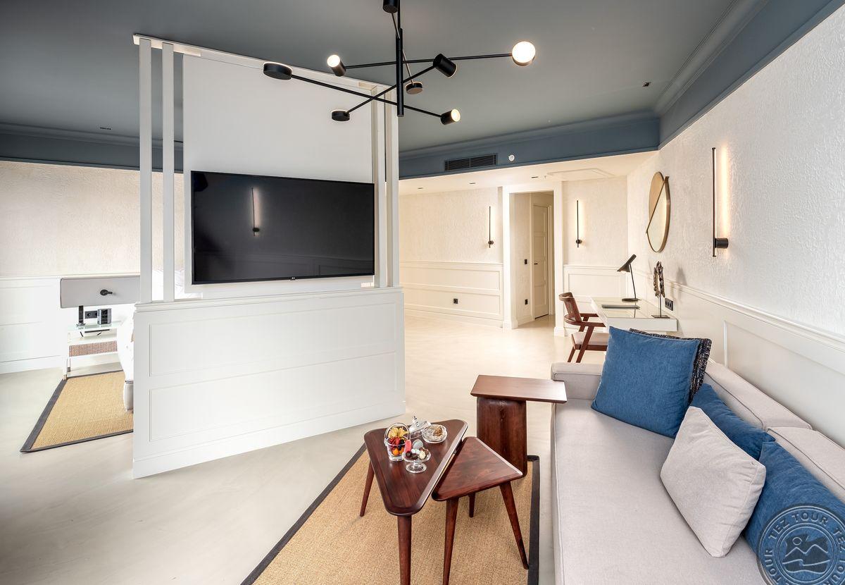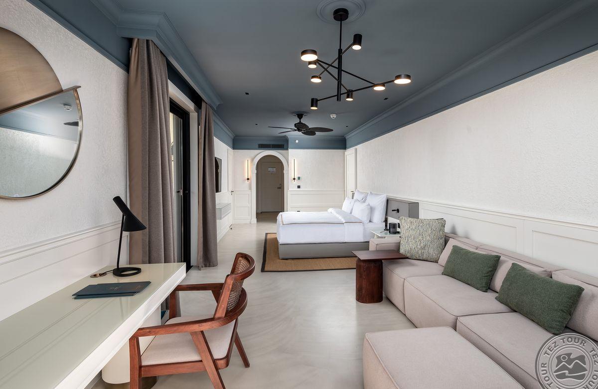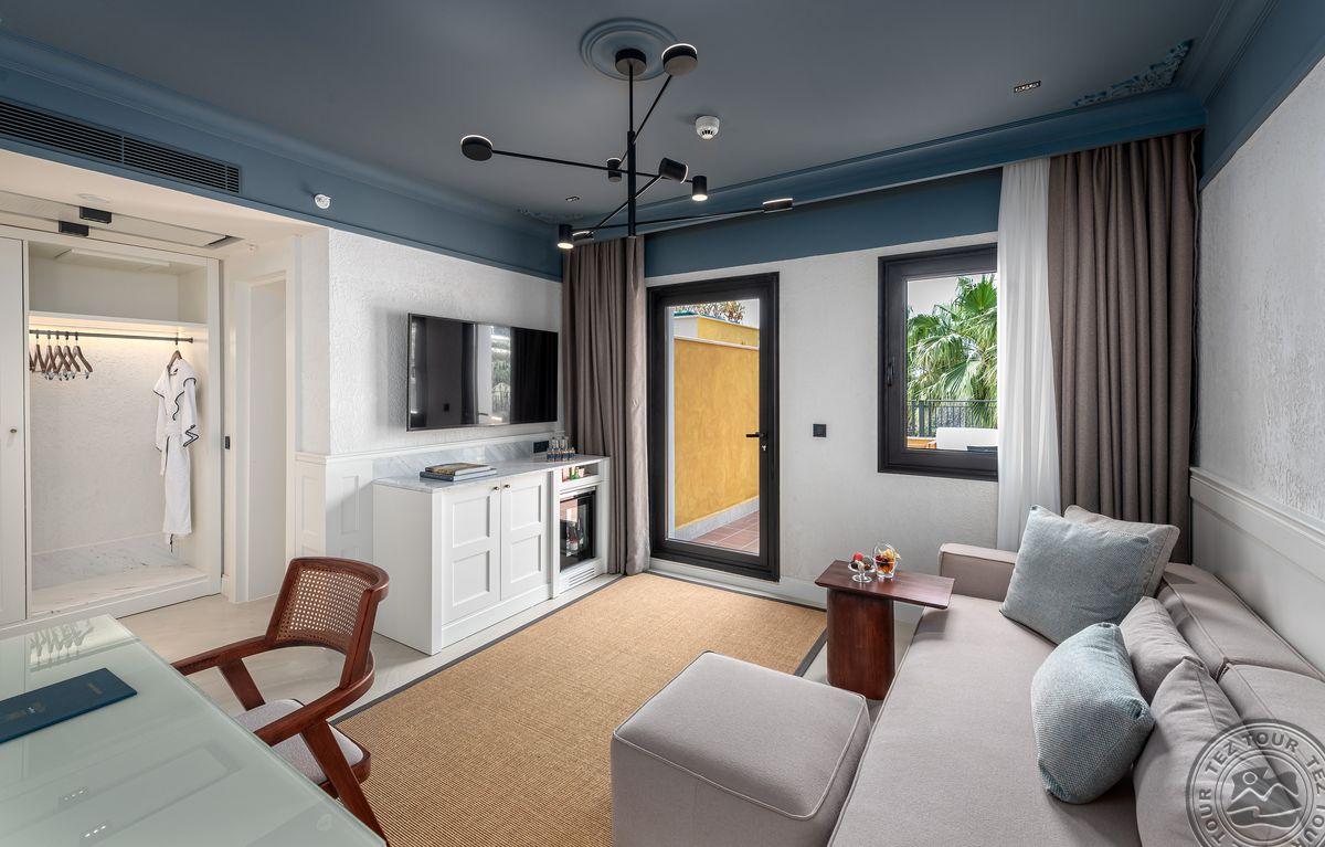 2 Junior Suite (vaizdas į baseiną ir jūrą, miegamasis su svetainės zona, dvigulė lova, vonios kambarys su dušu, terasa su gultais, maks. 3 asm., 90 kv.m);