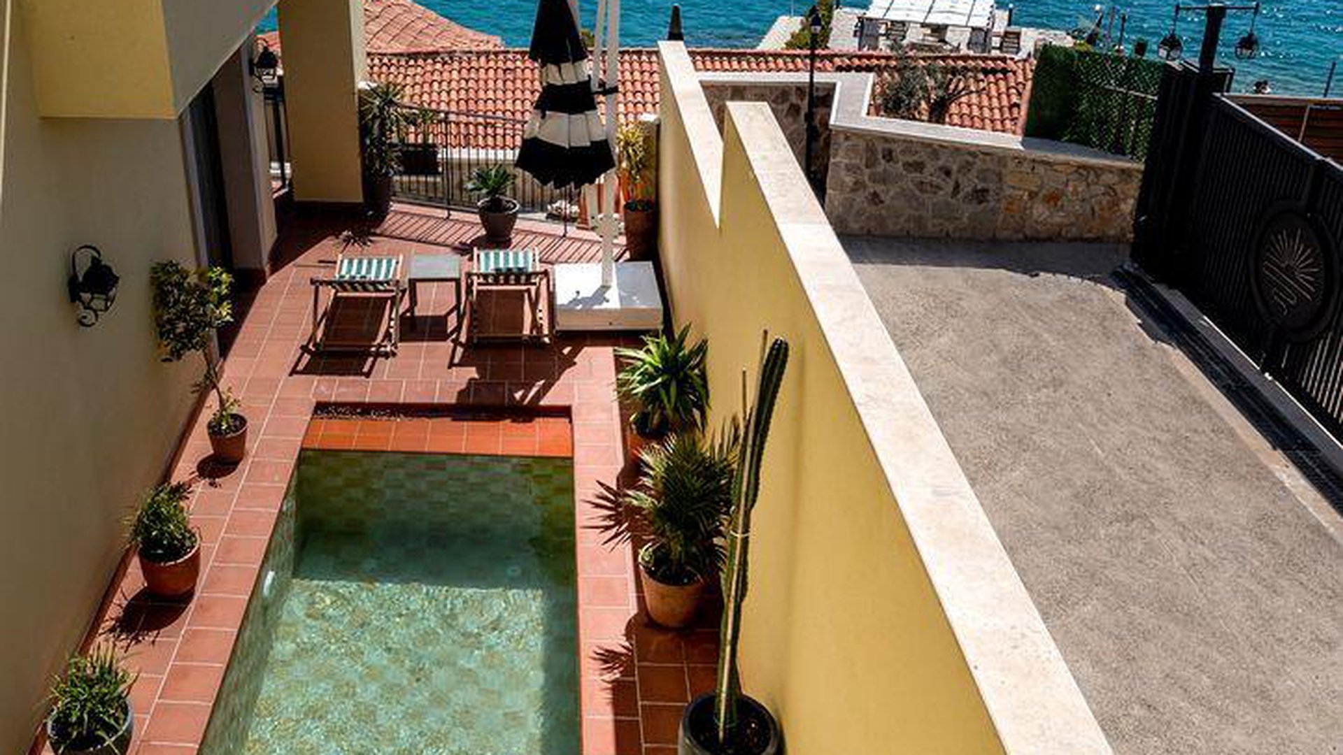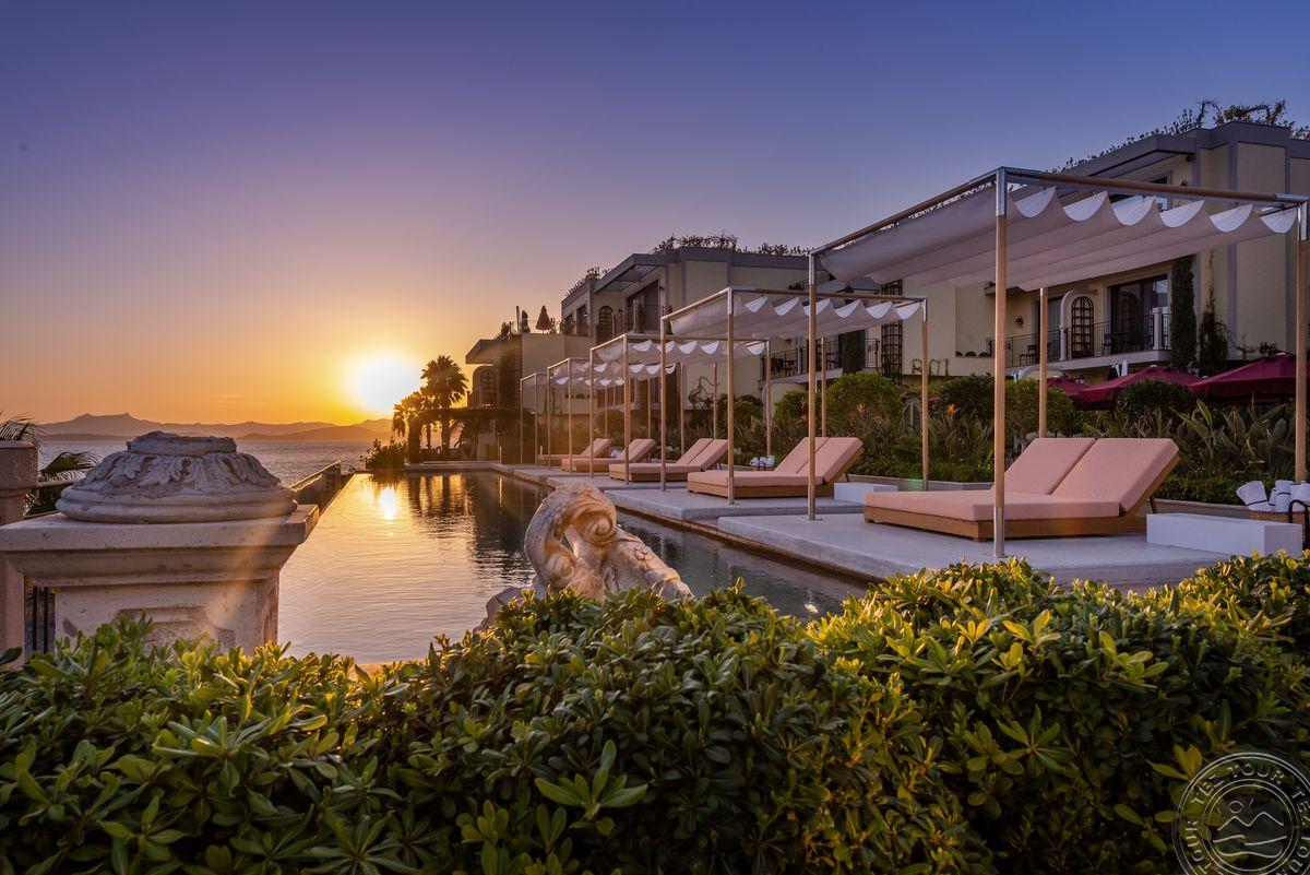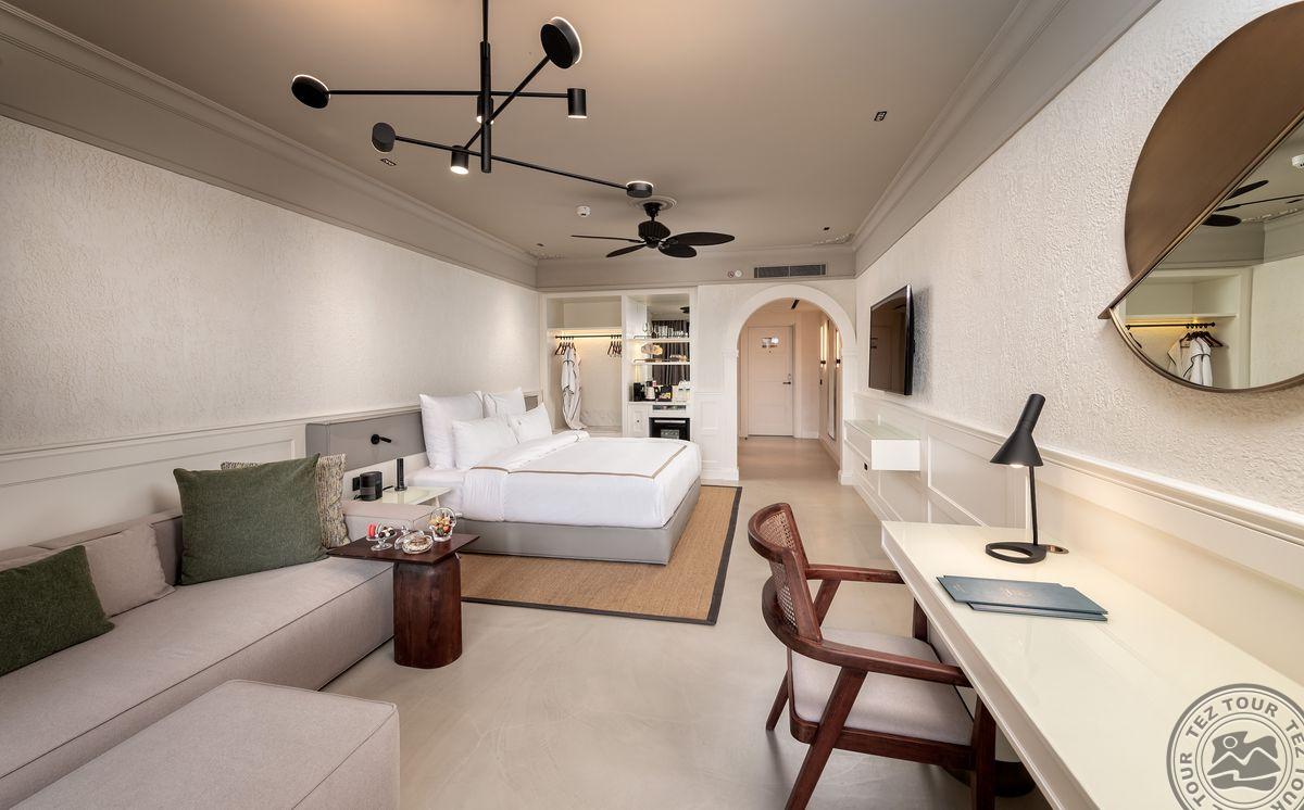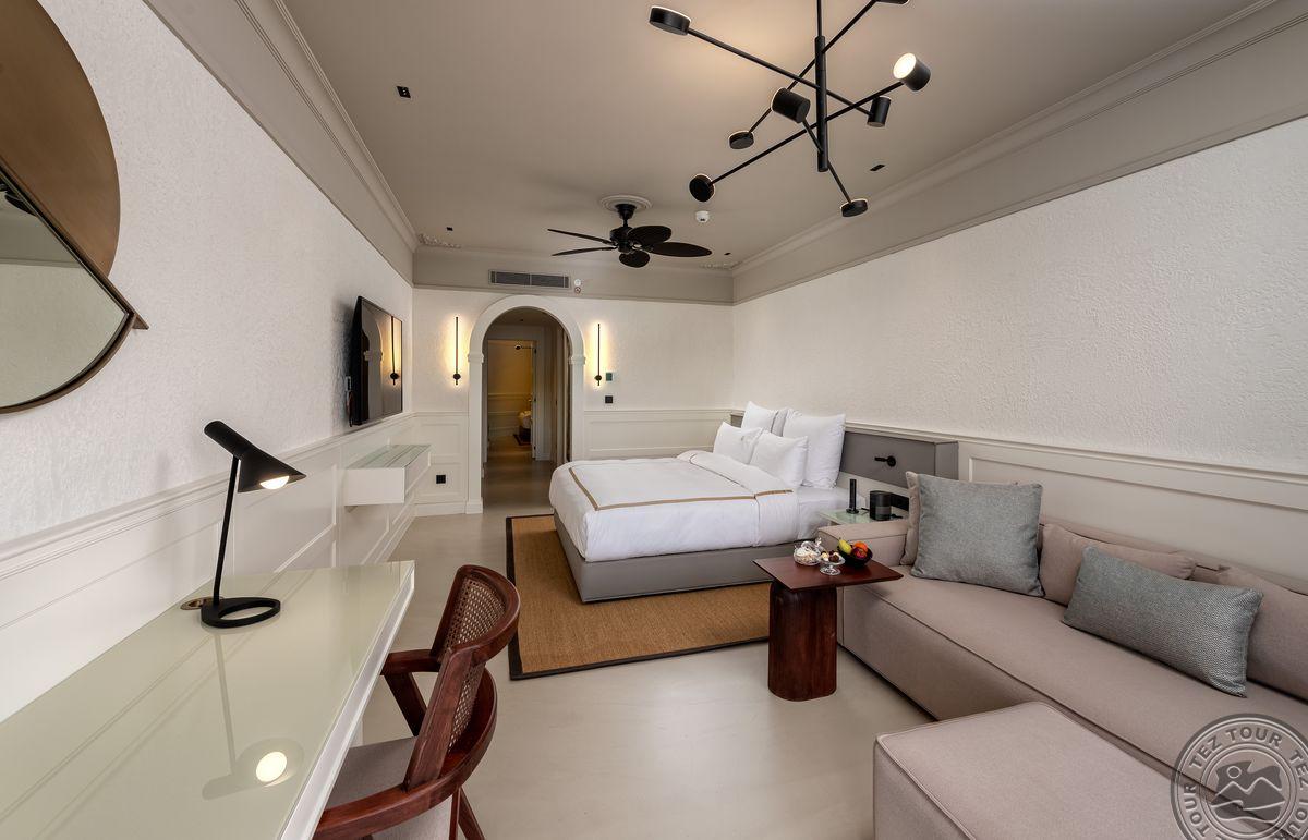 2 Junior Suite (vaizdas į baseiną ir jūrą, miegamasis su svetainės zona, dvigulė lova, vonios kambarys su dušu, terasa su gultais, maks. 3 asm., 90 kv.m);