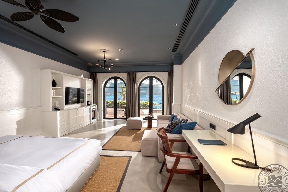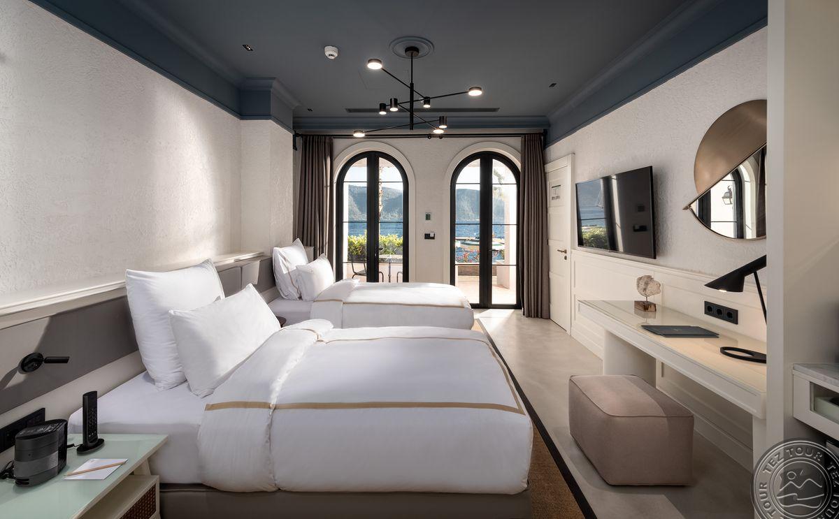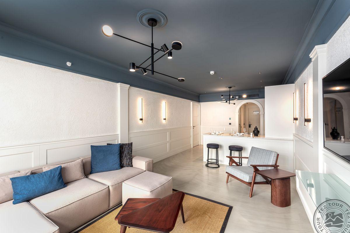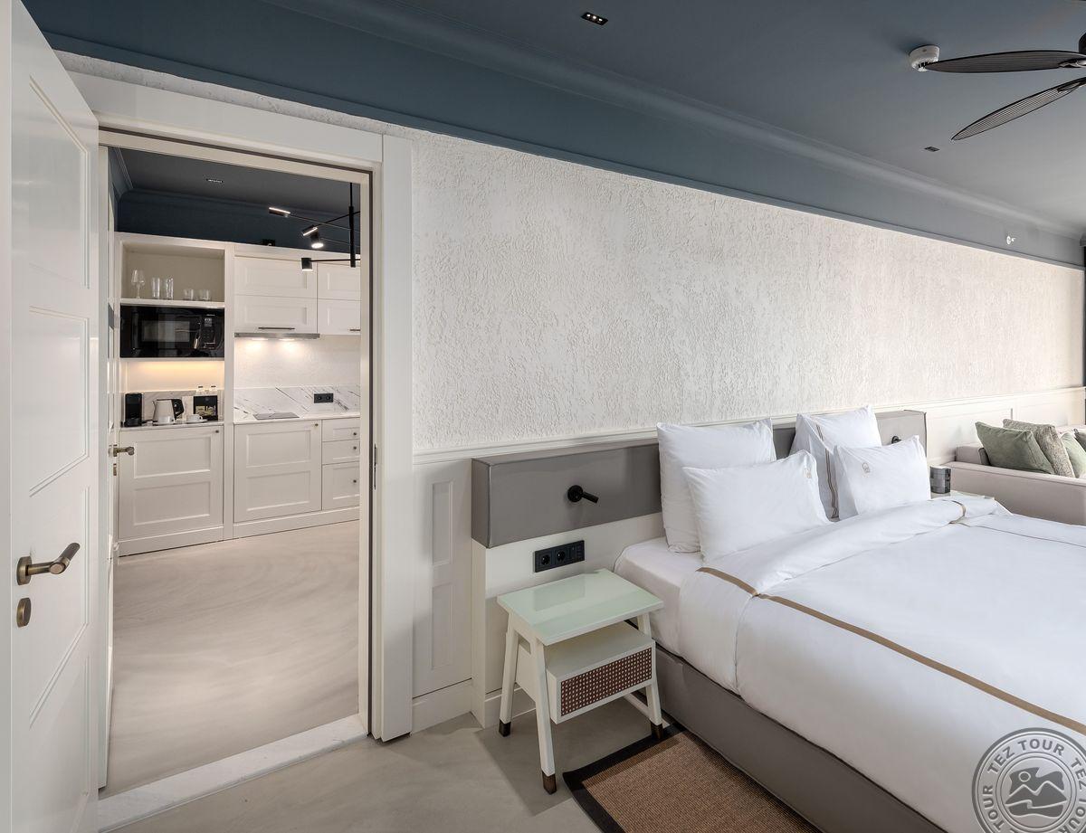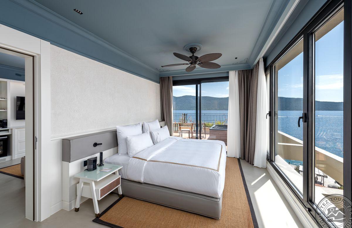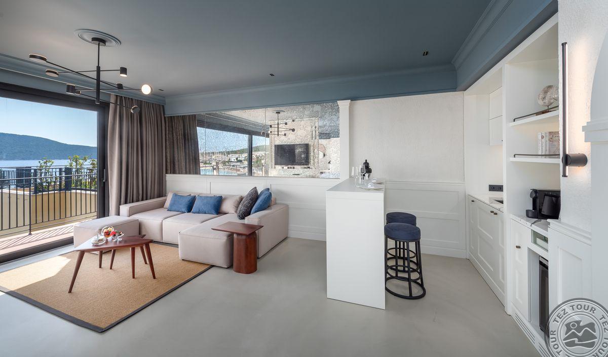 1 Bodrum Suite (vaizdas į jūrą, svetainė ir miegamasis, dvigulė lova, mini virtuvėlė, 2 vonios kambariai (dušas), balkonas, maks. 4 asm., 100 kv.m);