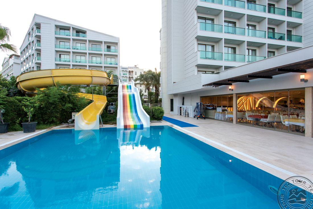 „Falcon Hotel“ siūlo privatų paplūdimį, kuriame galėsite mėgautis pavėsyje nuo paplūdimio skėčio arba atsipalaiduoti ant gulto, o iki prekybos centro „MarkAntalya“ nuvažiuosite per 10 minučių. Nemokamas vandens parkas ir uždaras baseinas suteikia linksmybių, o pasilepinti svečiai gali apsilankyti SPA centre, kuriame atliekami giliųjų audinių masažai, kūno įvyniojimai ir aromaterapija. Viename iš 3 restoranų Main, kurio specializacija yra tarptautinė virtuvė ir kuriame siūlomi pietūs ir vakarienė. Kiti akcentai šiame prabangiame viešbutyje yra 4 barai / poilsio kambariai, nemokamas vaikų klubas ir baras prie baseino. Rekomenduojama šeimoms ir aktyvioms atostogoms.