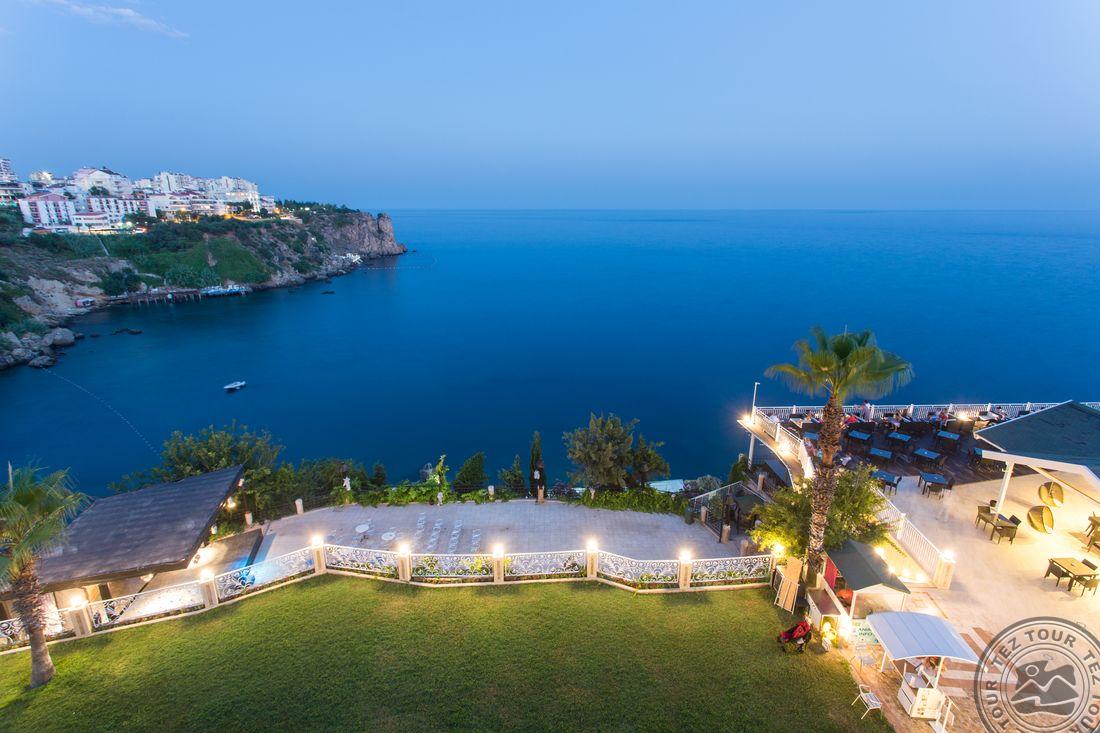 Apie 17 km iki oro uosto, apie 5 km iki Antalijos miesto centro, ant aukšto jūros kranto.