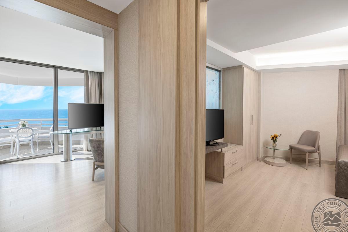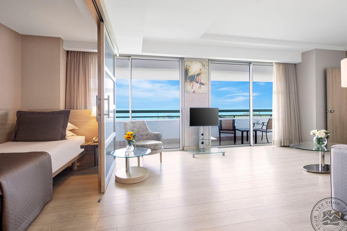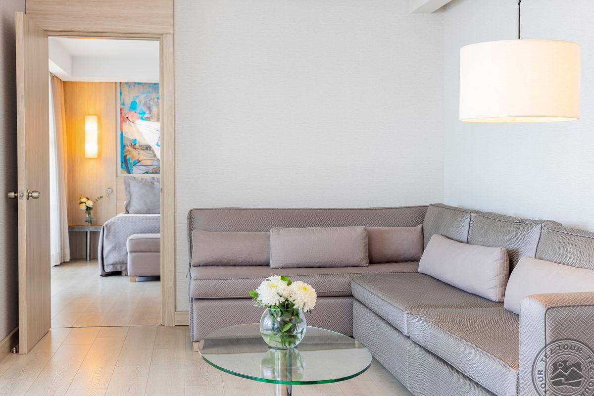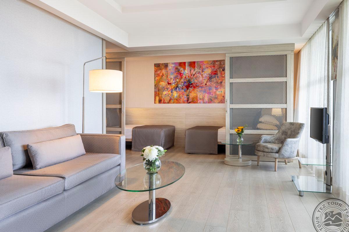 4 trijų kambarių Deluxe grand suite tipo numeriai (su vaizdu į jūrą, svetainė, 2 miegamieji su french bed tipo lova: vienas iš jų atskirtas durimis, kitas su šiaudine pertvara, 2 TV, 2 vonios kambariai (vienas iš jų su dušo kabina), maks. 4 asm., 62–70 m2).