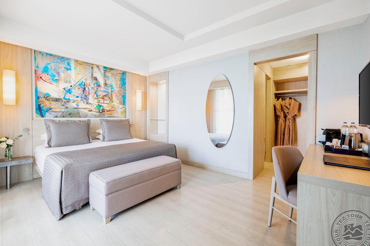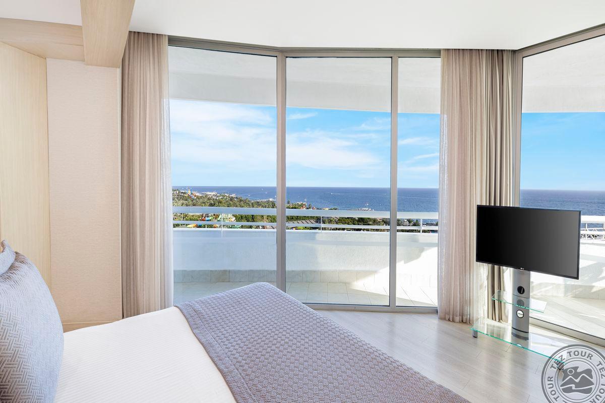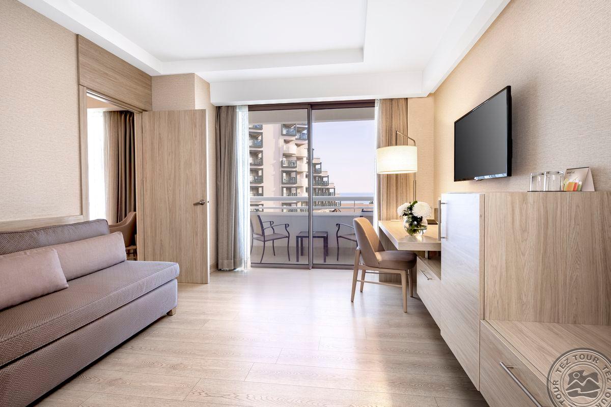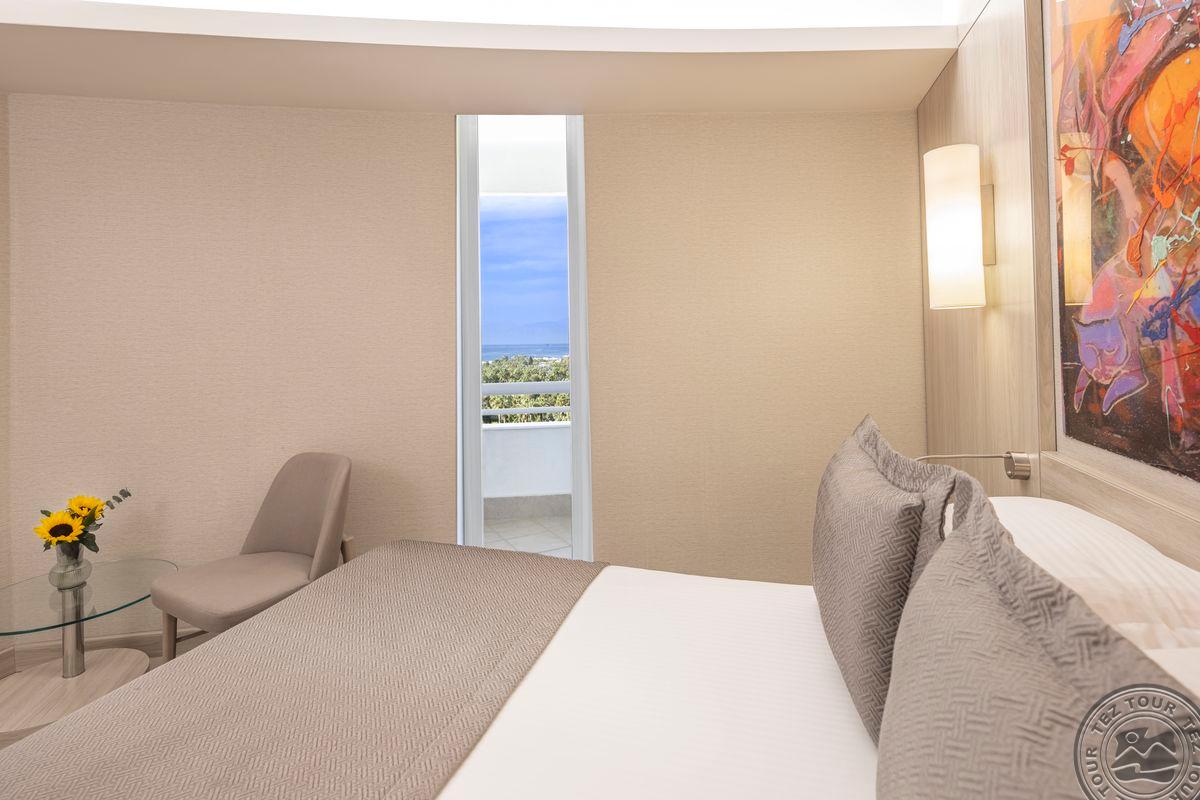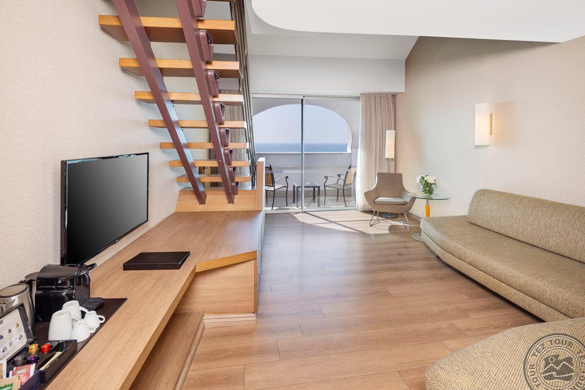 4 trijų kambarių Deluxe grand suite tipo numeriai (su vaizdu į jūrą, svetainė, 2 miegamieji su french bed tipo lova: vienas iš jų atskirtas durimis, kitas su šiaudine pertvara, 2 TV, 2 vonios kambariai (vienas iš jų su dušo kabina), maks. 4 asm., 62–70 m2).