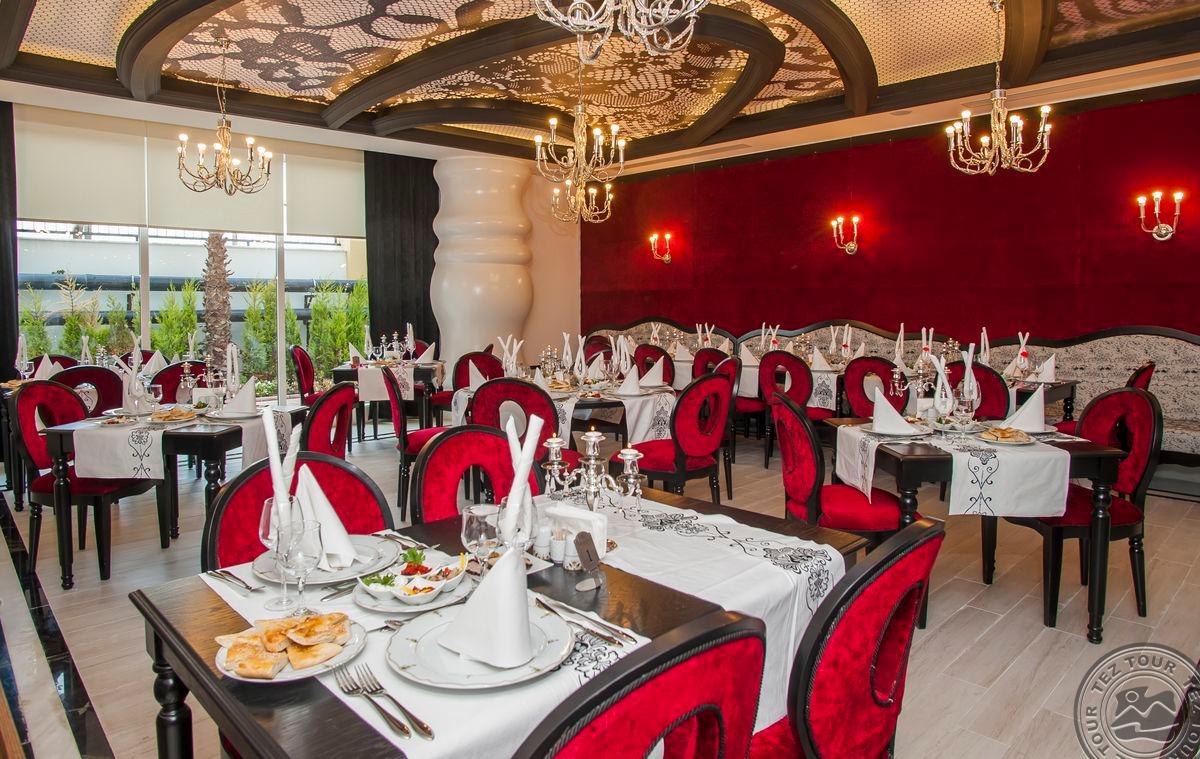 • a la carte restoranai: 3 (turkiškas, žuvies, italų - pagal išankstinę rezervaciją, viešnagės metu galima nemokamai apsilankyti viename restorane 1 kartą)