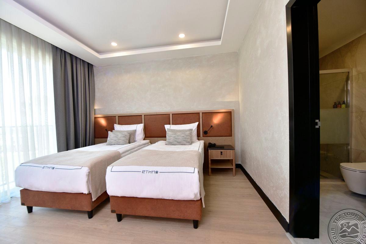 2 dviejų aukštų Ethno villa 4+1 tipo numeriai (pirmame aukšte svetainė su mini virtuve, miegamasis atskirtas durimis, vonios kambarys, terasa su išėjimu prie baseino; antrame aukšte 3 miegamieji atskirti durimis, 3 vonios kambariai, maks. 8+1 asm., 675 m2).