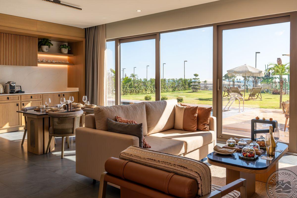 2 dviejų kambarių Family swim up suite infinity sea view tipo numeriai (tiesioginis išėjimas prie baseino, du miegamieji atskirti durimis, 3 vonios kambariai, maks.4+1 asm., 125 m2).