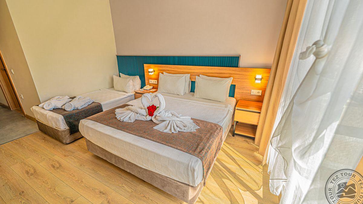 16 dviejų kambarių family room tipo numerių (2 miegamieji atskirti arba neatskirti durimis, maks. 4+1 asm., 26 m2).
