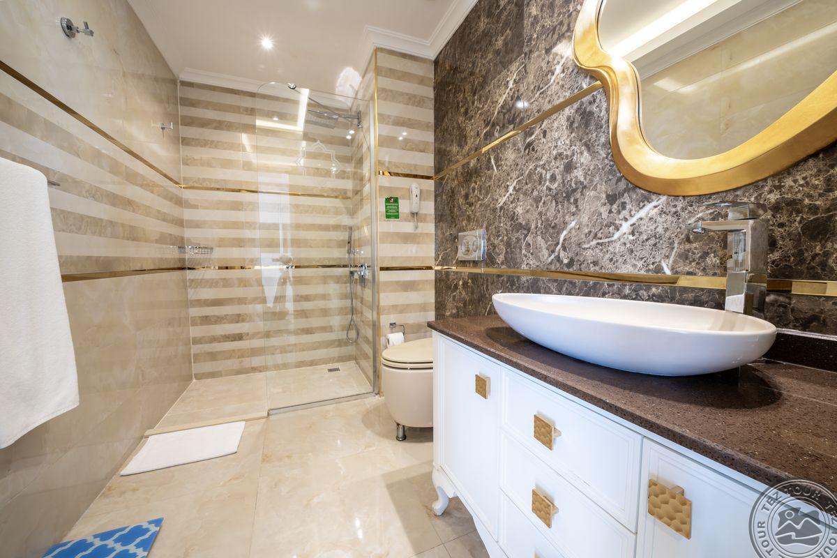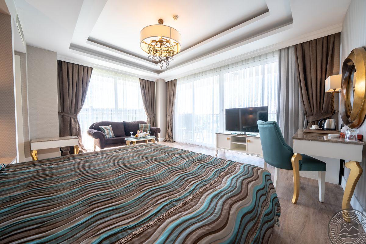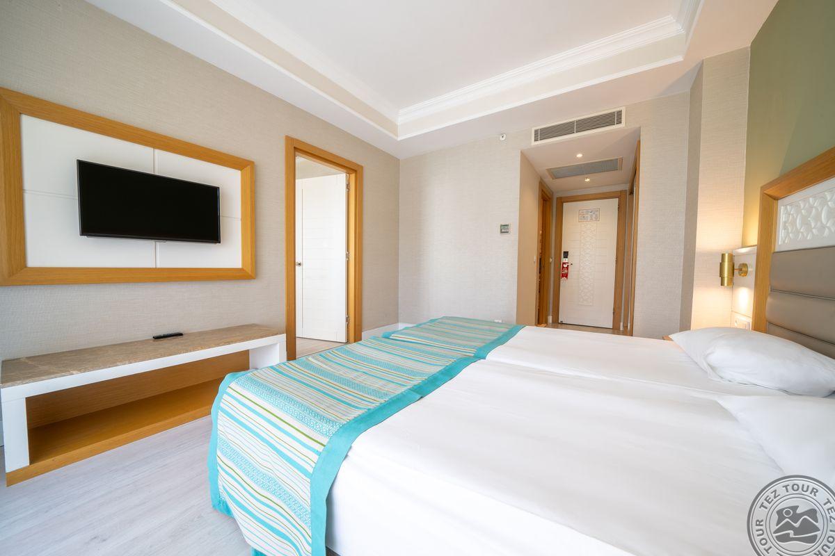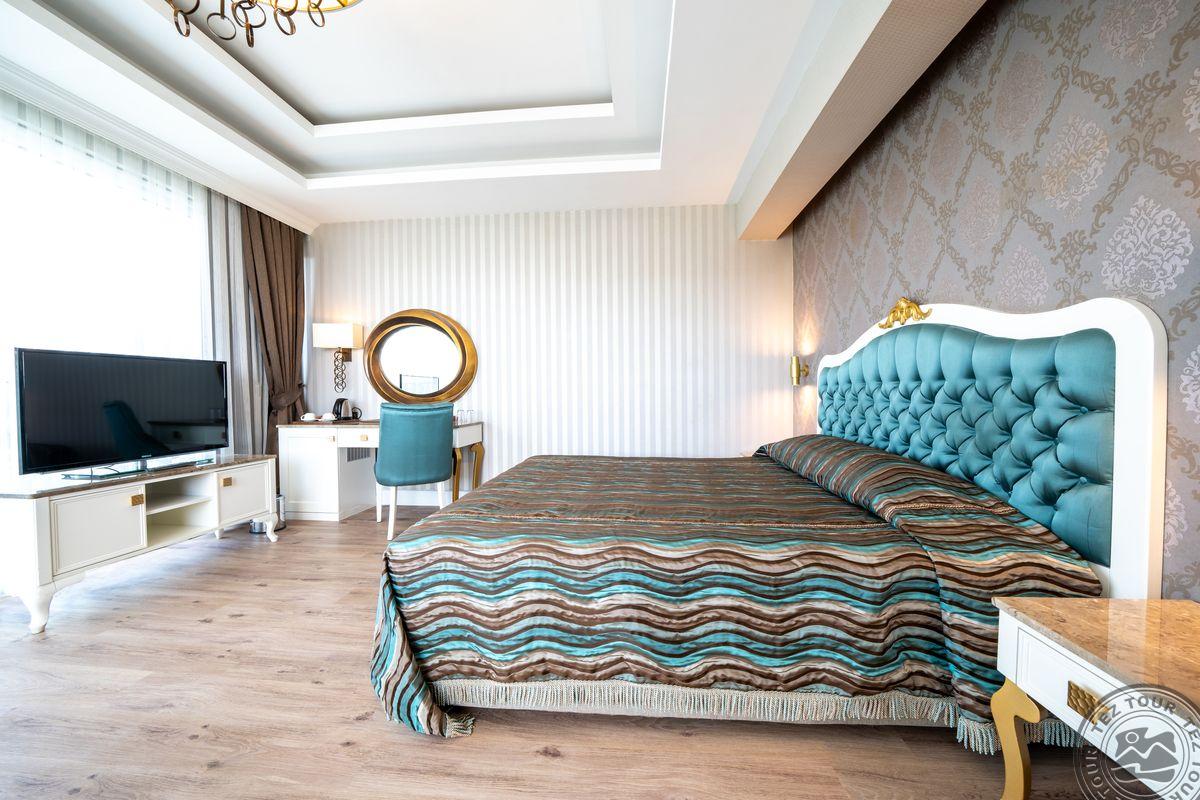 6 corner de-luxe room tipo numeriai (miegamasis su svetainės zona, dvigulė lova, privilegijos: wifi nemokamas, kavos/arbatos gaminimo rinkinys, vaisiai, vynas, 10 proc. nuolaida SPA centre, 50 proc. nuolaida a la carte restorane, 50 proc. nuolaida paplūdimio pavėsinei, maks. 2+2 arba 3 asm., 40 kv.m).