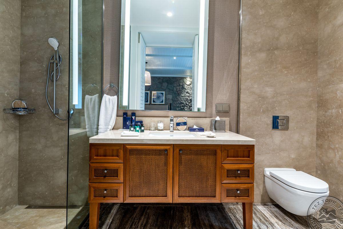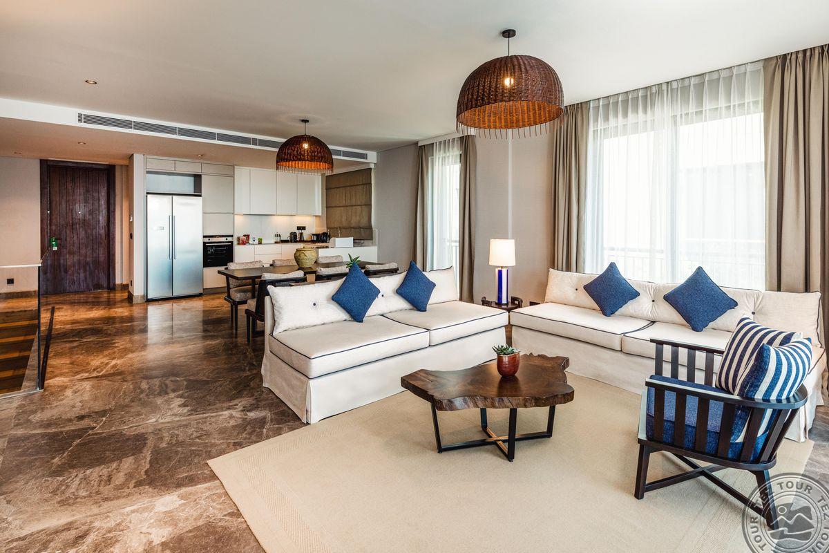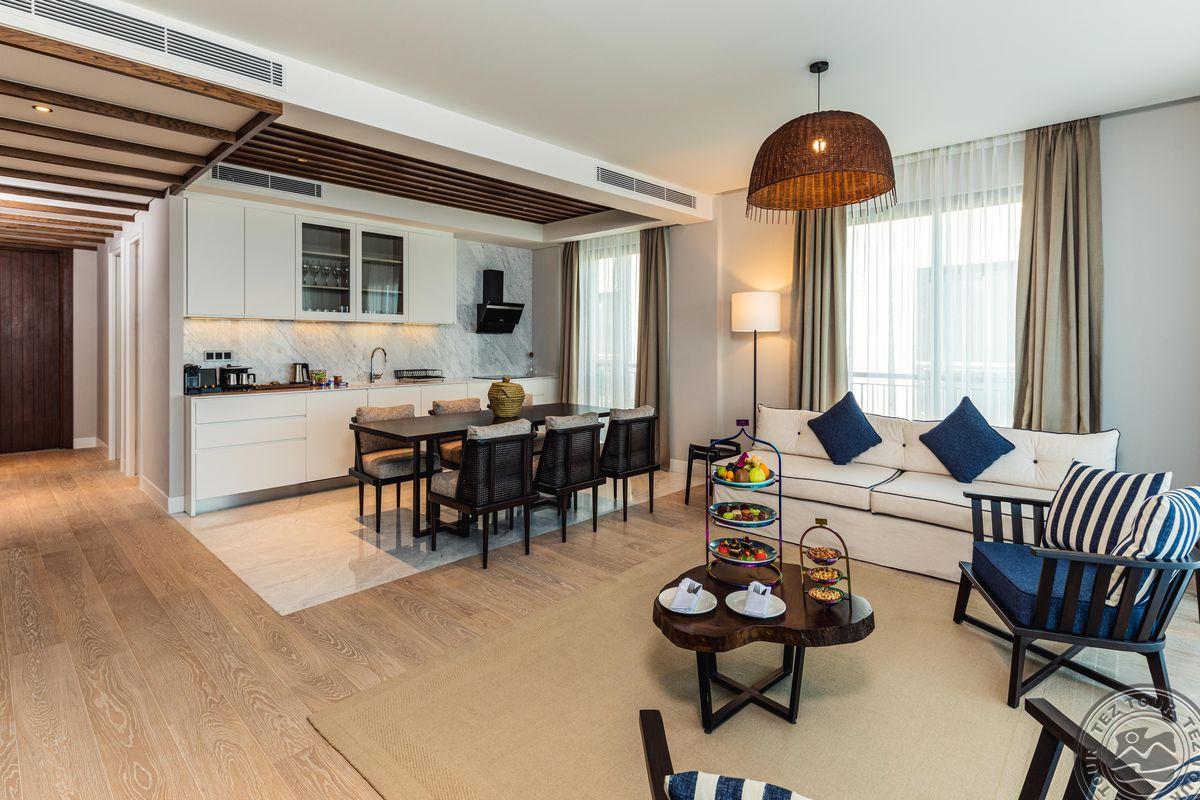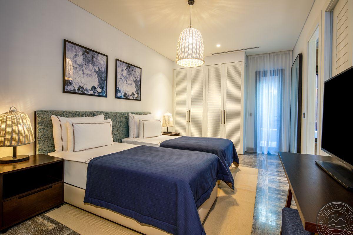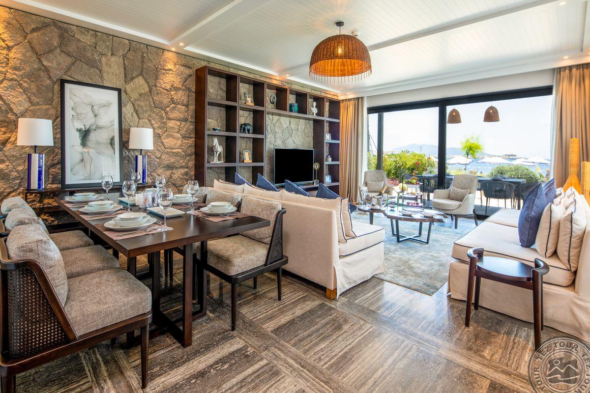 Beach Villa tipo vilos (šalia paplūdimio, su vaizdu į jūrą, svetainė su sofa-lova, 4 miegamieji (dvigulė ir viengulės lovos), virtuvė ir visi reikalingi virtuvės reikmenys, 6 tualetai, 5 vonios kambariai su dušu, privatus atviras baseinas ir sodas, liokajaus paslaugos, maks. 10+2 asm, 486 m2).
