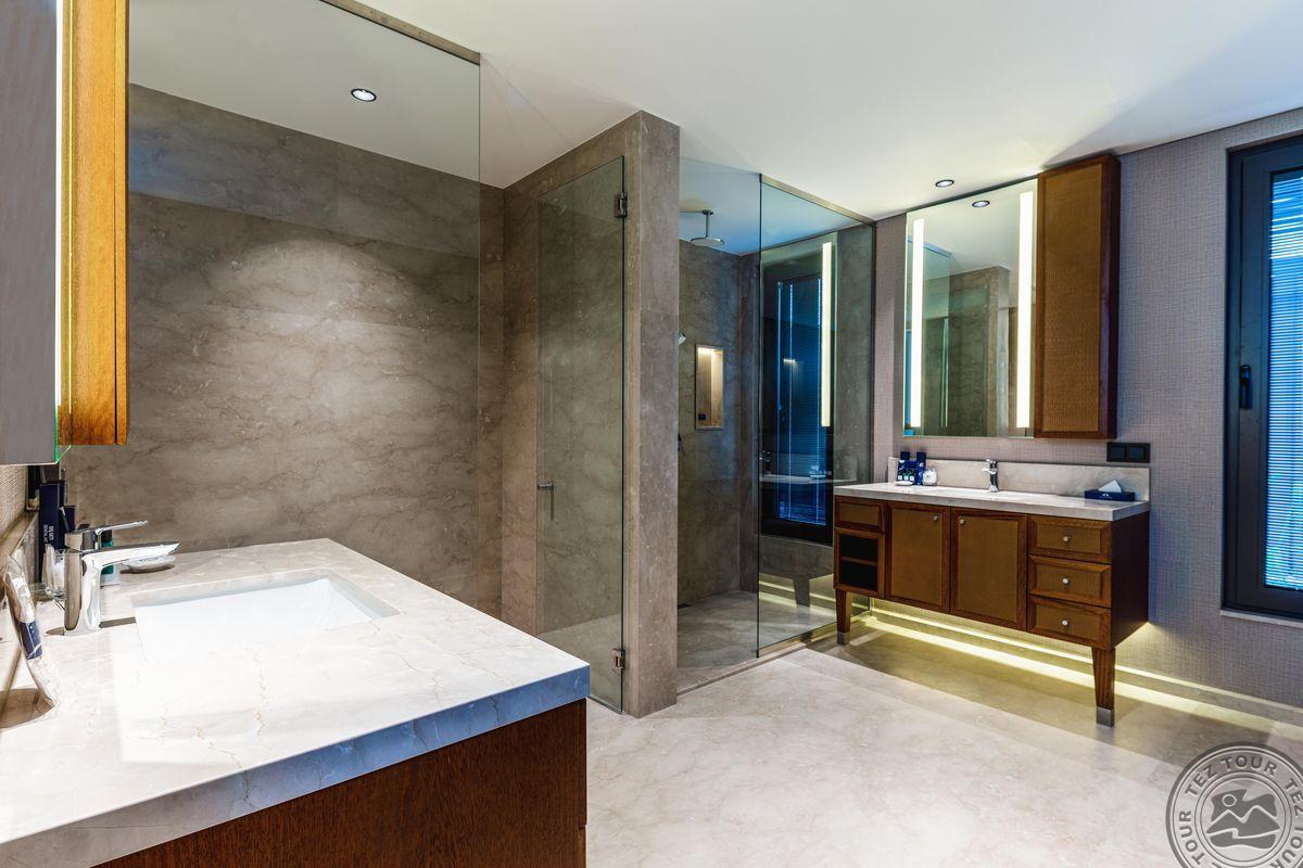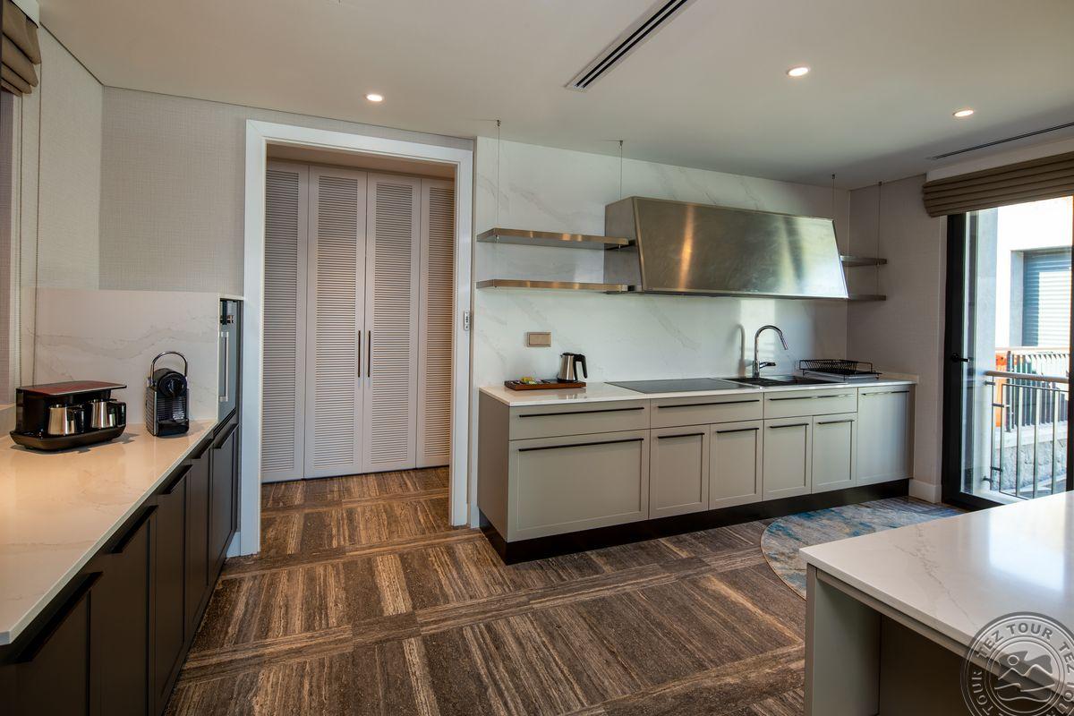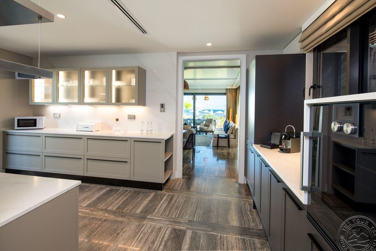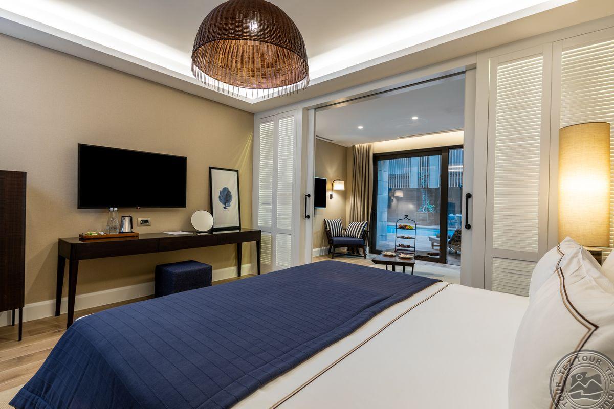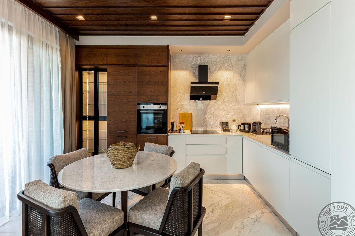 Beach Villa tipo vilos (šalia paplūdimio, su vaizdu į jūrą, svetainė su sofa-lova, 4 miegamieji (dvigulė ir viengulės lovos), virtuvė ir visi reikalingi virtuvės reikmenys, 6 tualetai, 5 vonios kambariai su dušu, privatus atviras baseinas ir sodas, liokajaus paslaugos, maks. 10+2 asm, 486 m2).